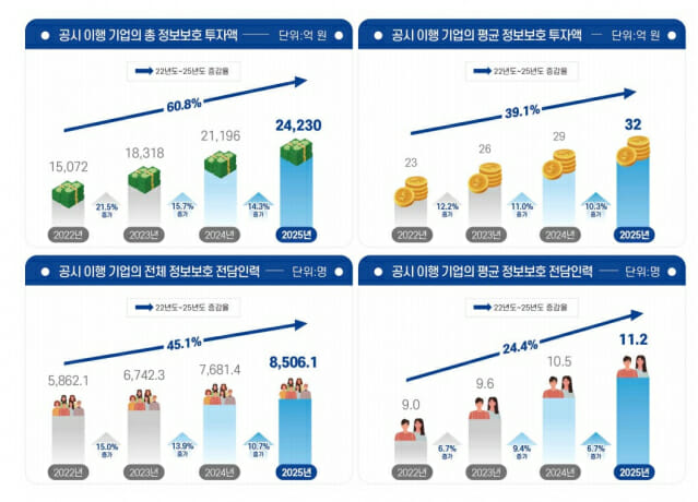 과기정통부가 올해 기업의 정보보호 투자를 분석한 결과, 업종별 평균 투자액은 금융 및 보험업(85억원), 정보통신업(62억원), 도매 및 소매업(32억원) 순으로 높았다. 또 업종별 평균 정보보호 전담인력은 정보통신업(25.4명)이 가장 많았고 금융 및 보험업(22.8명), 도매 및 소매업(9.8명) 이 뒤를 이었다. 30일 과기정통부는 이 같은 내용을 담은 '2025년 정보보호 공시 현황 분석보고서'를 공개했다. 정보보호공시 제도는 기업의 정보보호 현황을 공개(의무·자율)하고 관리, 이용자의 안전한 인터넷 이용과 기업의 정보보호 투자 확대를 도모하기 위한 것으로 2021년 12월 의무화가 시행됐다. 의무 대상은 인터넷 서비스 제공자(ISP), 인터넷 데이터 센터(IDC), 상급종합병원, 인터넷 기반 자원공유(클라우드)컴퓨팅 제공자, 정보보호최고책임자(CISO) 지정 의무기업 중 매출액 3천억원 이상 과 일일 평균 이용자수 100만명 이상 사업자 등으로 총 666개사에 달한다. 공시 내용은 정보보호 투자 및 전담인력 현황, 정보보호 인증, 평가, 점검 등에 관한 사항,정보통신서비스를 이용하는 자의 정보보호를 위한 활동 등이다. 이날 발표한 보고서는 2025년 한 해 동안 공시를 이행한 773개 기업을 대상으로 분석한 자료로 773개사중 666개사는 의무공시 대상 기업이고, 107개사는 자율공시 기업이다. 자율공시 기업 참여가 작년(91개사)보다 17.6% 증가했다. 이는 정보보호 공시 제도에 대한 민간기업의 관심이 꾸준히 증가하고 있음을 보여준다고 과기정통부는 설명했다. 보고서에 따르면, 올해 정보보호 투자액(2조 4230억원)은 전년(2조 1196억원)보다 14.3% 증가했고, 정보보호 전담인력(8506.1명)도 전년(7681.4명)보다 10.7% 늘었다. 특히, 정보보호 공시제도의 실효성 분석을 위해 정보보호 공시제도가 의무화('22년~)된 이후 계속해서 공시를 이행한 4년 연속 공시 기업(559개사)과 2년 연속 공시 기업(679개사)을 비교한 결과, 4년 연속 공시한 기업이 월등히 높은 증가율을 보였다. 연속적으로 공시에 참여하고 있는 기업들의 정보보호 투자 및 인력 수준이 지속적으로 향상되고 있음을 보여준다고 과기정통부는 진단했다. 실제, 4년 연속 공시 기업의 평균 정보보호 투자액 증가율은 48.3%, 2년 연속 기업은 13.8%로 나타났고, 정보보호 전담인력 증가율도 4년 연속 공시 기업은 평균 36.6%, 2년 연속 기업은 9.9%였다. 업종별 평균 투자액은 금융 및 보험업(85억원), 정보통신업(62억원), 도매 및 소매업(32억원) 순으로 높았다. 또 사업시설 관리, 사업 지원 및 임대 서비스업, 보건업 및 사회복지 서비스업은 평균 정보보호 투자액이 전년 대비 감소했다. 업종별 평균 전담인력은 정보통신업(25.4명), 금융 및 보험업(22.8명), 도매 및 소매업(9.8명) 순으로 높았다. 사업시설 관리, 사업 지원 및 임대 서비스업, 보건업 및 사회복지 서비스업은 평균 전담인력 수도 전년 대비 소폭 줄었다. 이번 '2025년 정보보호 공시 현황 분석 보고서'는 정보보호 공시 종합 포털 'isds.kisa.or.kr'에서 확인 할 수 있다. 한편 과기정통부는 민·관 정보보호 역량 강화를 위한 범부처 정보보호 종합대책(10.22) 후속 조치로 공시제도의 실효성 제고를 위해 공시 항목 세분화 등 '정보보호 공시에 관한 고시'개정을 추진 중이다. 상세 내용은 과기정통부 홈페이지 내 법령(입법행정예고) 메뉴에서 확인할 수 있다. 최우혁 과기정통부 정보보호네트워크정책실장은 “정보보호 공시제도가 기업의 정보보호 수준을 객관적으로 공개함으로써, 기업의 자율적 정보보호 활동을 유도하고, 보안 투자 및 인력 확충으로 이어지는 긍정적인 성과를 창출하고 있다"면서 "정부는 이용자에게 정확하고 투명한 정보가 제공될 수 있도록 공시 항목의 세분화와 검증체계 강화는 물론, 공시 의무대상 확대와 같은 제도적 기반 확충을 통해 안전하고 신뢰할 수 있는 디지털 환경 조성에 더욱 박차를 가하겠다"고 밝혔다.
