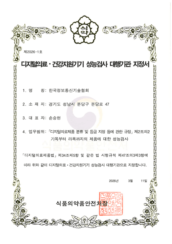 한국정보통신기술협회(이하 TTA)는 식품의약품안전처(MFDS)로부터 디지털의료, 건강지원기기 성능검사 대행기관와 성능인증 업무 대행기관으로 지정됐다고 12일 밝혔다. 이에 TTA는 웨어러블 기기나 건강관리 기기 등 디지털 헬스 제품의 측정 정확도를 검사하고 인증하는 역할을 수행한다. 디지털의료, 건강지원기기 성능인증 제도는 디지털의료제품법 제34조에 근거한 제도로 심박수, 산소포화도, 체성분 등 생체신호와 생리지표를 측정하는 기기의 정확도를 검사하고 기준을 충족한 제품에 인증을 부여한다. 이에 따라 소비자는 성능이 검증된 신뢰할 수 있는 제품을 안심하고 선택하여 사용하고, 기업은 제품의 가치를 공신력 있게 인정받을 수 있다. TTA는 ICT 표준 제정, 시험, 인증 대표전문기관으로 지난해 MFDS로부터 디지털의료제품 규제지원센터(전자적 침해행위 예방 및 확산 방지 분야)로 지정된 바 있으며, 이번 추가 지정을 계기로 디지털 헬스 분야 검사, 인증 역량을 확대하는 동시에 의료기기 기술지원 사업도 강화할 계획이다. 아울러 AI 기반 의료산업 확산에 대응하기 위해 올해 AX SW연구소 산하 담당조직을 의료AX단으로 확대 개편하고 의료기기 소프트웨어, 사이버보안 평가기술 개발 등 연구개발을 수행하고 있다. 의료기기 소프트웨어 적합성 진단(IEC 62304), 성능검증, 인허가 전략 수립 등 기업 대상 규제 지원 서비스도 새롭게 제공한다. 손승현 TTA 회장은 “디지털의료, 건강지원기기는 국민 건강과 직결되는 만큼 성능과 신뢰성 확보가 중요하다”며 “TTA는 공정하고 전문적인 검사 인증 서비스와 규제 지원 서비스를 통해 신뢰할 수 있는 디지털의료 제품 확산에 기여하겠다”고 밝혔다.