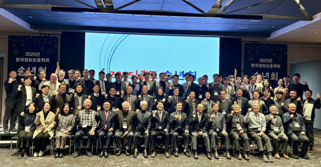 한국정보보호학회는 12일 웨스틴 서울 파르나스 아틀라스홀에서 '2025년 한국정보보호학회 송년회'를 개최했다. 박영호 한국정보보호학회 회장은 "올해 많은 사고로 어려운 환경이었지만, 정보호호학회의 송년회를 무사히 치를 수 있음에 감사하다"고 소감을 밝혔다. 박 회장은 올해를 끝으로 학회장 자리를 물러난다. 내년 1월부터 새로 회장을 맡는 김호원 부산대 컴퓨터공학과 교수는 "정보보호학회가 많은 성과를 이룰 수 있었던 데에는 박 회장의 공이 크다"며 "전임 회장에 이어 학회가 눈부신 성과를 기록할 수 있도록 최선을 다하겠다"고 약속했다. 내년 수석부회장은 이정현 숭실대 소프트웨어학부 교수가 맡는다. 이 교수는 학회 처음으로 온라인 투표로 이뤄진 3인 경선에서 최고 득표를 받아 수석 부회장에 선출됐다. 이 교수는 "새로 부회장으로 부임하면 학회장을 잘 보필해 학회가 학술적 성과를 높일 수 있게 잘 보필하겠다"고 말했다. 이날 행사에서 여러 시상도 이뤄졌다. 학회 최고상인 논문상은 한동구 국민대 교수가, 국제학술부문상은 성신여대 이일구 교수가, 신진연구자상은 강원대 이동원 교수가 각각 받았다.