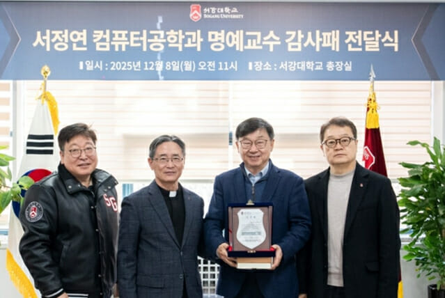 서강대학교(총장 심종혁)는 8일 오전 본관 2층 총장실에서 서정연 서강대학교 컴퓨터공학과 명예교수에게 감사패를 수여했다. 이날 행사에는 서정연 교수와 심종혁 총장, 송태경 대외부총장, 이상근 대외교류처장이 참석했다. 서정연 교수는 서강대학교 수학과 75학번으로, 1995년부터 2022년까지 서강대학교 컴퓨터공학과 전임교수로 재직하며 교육과 연구에 헌신해 왔다. 인공지능 및 자연어처리 분야의 권위자로 LG AI 연구원 기술 자문, 자유대화 AI 데이터 개발 등 다수의 핵심 연구 과제에 참여하며 국내 AI 연구 발전에 크게 이바지했다. 현재는 재단법인 이노베이션아카데미 이사장으로서 디지털 융합 인재와 소프트웨어 혁신 인재 양성의 중역을 맡고 있다. 또 지난 5일 소프트웨어융합대학 발전기금 1천만 원 기부를 포함, 서강대학교 발전기금으로 지금까지 총 1억 6천만 원을 기부하며 모교 발전에도 깊은 뜻을 더해왔다. 서정연 교수는 “이제 모든 것이 AI로 연결되는 흐름을 부정할 수 없다”면서 “대학 또한 AI를 폭넓게 융합할 수 있는 교육 방향으로 나아가야 한다”고 강조했다. 심종혁 총장은 “학교 차원에서도 AI 혁신 교육과 인재 양성을 위해 적극적으로 지원하고 있다”면서 “이번에 전달주신 발전기금은 AI 시대를 선도하는 대학을 만드는 데 큰 힘이 될 것”이라고 감사를 전했다.