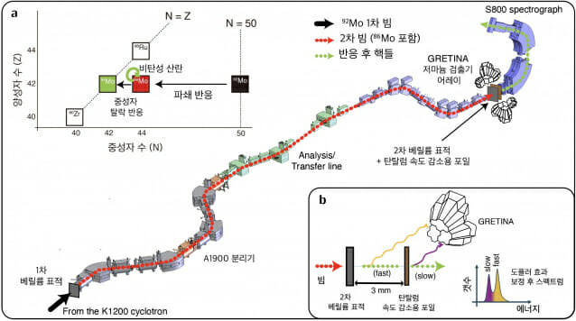 우리나라를 비롯한 이탈리아, 미국, 프랑스 등 4개국 연구진이 원자핵 구조가 뒤집히는 독특한 물리현상인 '반전의 섬'을 추가로 발견했다. 이는 물이 낮은 곳에서 높은 곳으로 흐르는 것과 유사한 현상이다. 기초과학연구원(IBS)은 희귀핵연구단 하정수 YSF가 3개국 연구팀과 그동안 중성자가 매우 많은 핵에서만 나타난다고 알려졌던 '반전의 섬(Island of Inversion)' 현상을 양성자와 중성자 수가 같은 '대칭 핵'에서도 처음 확인했다고 8일 밝혔다. 이 연구는 희귀핵연구단과 이탈리아 파도바 대학교, 미국 미시간 주립 대학교, 프랑스 스트라스부르 대학교 등이 참여했다. 연구 결과는 국제학술지 '네이처 커뮤니케이션즈에 게재됐다. YSF는 IBS의 차세대 연구리더 육성 프로그램으로 영 사이언티스트 펠로우라고 부른다. 원자핵은 핵자(양성자와 중성자)가 여러 층의 껍질에 배치되는데, 통상 에너지가 낮은 껍질부터 채워지며 안정된 형태를 유지한다. 그러나 특정조건에서는 에너지가 높은 층의 껍질에 자리할 때 오히려 더 안정된 상태가 되는 역전 현상이 일어나는데, 이를 '반전의 섬'이라고 부른다. 기존에 알려진 '반전의 섬'은 ▲중성자 과다로 인한 껍질 간격 감소 ▲전통적 마법수의 에너지 장벽 낮아짐 ▲텐서(force) 및 스핀-궤도 상호작용의 변화 ▲중성자 비율이 높아지면 양성자·중성자의 궤도 상호작용이 변하면서 적층된 에너지 준위 재배열 등의 요인에 따라 발생하는 것으로 알려져 있다. 예를 들어 전통적 핵껍질 모형에서는 2, 8, 20, 28, 50, 82, 126 등이 마법수로 불린다. 이 숫자에 해당하는 핵은 상대적으로 안정적이지만, 중성자 수가 극단적으로 많아지면 '반전의 섬' 현상이 발생한다. 연구팀은 몰리브덴-84와 몰리브덴-86이라는 중성자가 적은 두 희귀 핵을 비교한 결과 이같은 '반전의 섬'을 확인했다. 이들 두 핵은 양성자 수(42개)가 같고 중성자만 두 개가 차이(각각 42개, 44개)가 난다. 실험은 미국 미시간 주립 대학교 국립 초전도 사이클로트론 연구소(NSCL)에서 생성된 몰리브덴-84와 몰리브덴-86 방사성동위원소 빔을 표적에 충돌시키는 방식으로 진행됐다. 빔이 표적에 충돌하면 원자핵은 잠시 에너지를 머금은 들뜬 상태가 되고, 이후 감마선을 방출하며 다시 에너지가 낮은 본래의 안정된 구조인 바닥 상태로 돌아간다. 연구팀은 이때 방출되는 감마선을 정밀하게 측정해 들뜬 상태가 얼마나 지속됐는지 측정했다. 원자핵이 바닥 상태로 되돌아가는 데 걸리는 시간은 원자핵의 실제 구조가 어떤 형태인지를 밝히는 단서가 되기 때문이다. 분석 결과, 몰리브덴-84는 바닥 상태로 매우 빠르게 복귀했으며, 길게 늘어나거나 납작해진 강한 변형을 보였다. 반면 몰리브덴-86은 변형이 훨씬 적었다. 중성자 단 2개의 차이로 원자핵의 모양과 구조가 크게 달라지는 뚜렷한 대비가 드러난 것이다. 연구팀이 이 데이터를 여러 핵 형태를 가정한 이론 계산과 비교한 결과 몰리브덴-84의 강한 변형은 여러 핵자가 높은 껍질을 차지하는 역전 현상이 일어날 때만 재현됨을 확인했다. 즉, 몰리브덴-84는 반전의 섬의 특성과 정확히 부합하는 구조를 갖는 것이다. 특히 몰리브덴-84는 양성자와 중성자 수가 같은 대칭 핵(N=Z)이다. 대칭 핵에서는 양성자와 중성자가 거의 구분되지 않고 함께 움직이기 때문에, 여러 핵자가 한꺼번에 높은 껍질로 이동하는 집단적 껍질 들뜸이 나타나기 유리하다. 하정수 YSF는 "이번 연구는 이러한 집단적 들뜸이 실제로 강한 변형과 구조 반전으로 이어진다는 것을 명확히 확인함으로써, 대칭 핵에서도 반전의 섬이 형성된다는 사실을 실험적으로 입증했다"고 설명했다. 연구팀은 또 이번에 확인된 구조 반전이 원자핵을 구성하는 핵력 중 하나인 '삼핵자 힘(three-nucleon force)'과 밀접하게 연관되어 있음을 밝혔다. 삼핵자 힘은 세 개의 핵자가 동시에 존재할 때 나타나는 추가 상호작용이다. 이론 계산에서 삼핵자 힘을 제외하면 실험에서 관측된 강한 변형이 재현되지 않았기 때문에 연구팀은 이 삼핵자 힘이 반전의 섬을 형성하는 핵심 요소라고 분석했다. 실험데이터 분석을 주도한 하정수 YSF는 “이번 연구는 대칭 핵에서도 반전의 섬이 나타날 수 있음을 보여준 첫 사례"라며 "원자핵 구조 변화에 대한 기존 이론을 확장하는 중요한 발견이다. 희귀동위원소의 구조 예측 정확도를 높이고 새로운 핵모델 개발에도 큰 도움이 될 것”이라고 설명했다.
