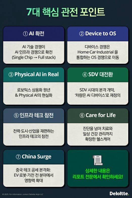 한국 딜로이트 그룹은 내달 6일부터 9일(현지시간)까지 미국 라스베이거스에서 열리는 세계 최대 IT·가전 박람회 'CES 2026'을 앞두고 핵심 포인트부터 현장 관람 추천 동선까지 담은 'CES 2026 프리뷰' 보고서를 발간했다고 18일 밝혔다. CES는 모빌리티, 인공지능(AI), 로보틱스, 가전, 헬스케어 등 미래 기술과 산업 변화를 선제적으로 조망할 수 있는 글로벌 혁신의 장이다. 이번 CES는 '혁신가들이 등장했다'라는 슬로건 아래, 기술 혁신이 실제 산업과 일상에 적용되는 사례가 대거 공개될 예정이다. 딜로이트는 이번 CES의 가장 큰 특징으로 혁신 기술이 비전과 개념 단계를 넘어 현장에 적용·검증되는 '실행과 실증의 무대'로 진화했다는 점을 꼽았다. 특히 AI가 모든 제품과 서비스에 본격 도입되며 글로벌 기업들의 실전 적용 사례가 소개될 전망이다. 아울러 AI·블록체인·양자·사이버 보안 등 미래 핵심 기술을 하나의 공간에 모은 'CES 파운드리'가 올해 처음 신설되며, CES가 혁신을 전시하는 쇼케이스를 넘어 기술이 만들어지고 검증되는 '제작소'로 전환되고 있다고 분석했다. 딜로이트는 이번 CES의 7대 핵심 관전 포인트로 ▲AI 확전 ▲기기에서 OS로 ▲현실 피지컬AI ▲SDV 대전환 ▲인프라 테크 참전 ▲라이프 케어 ▲중국의 출현을 제시했다. AI를 구동하는 전력과 데이터센터 인프라의 중요성이 커지면서 고대역폭메모리(HBM), 네트워크, 스토리지, 소프트웨어가 결합된 풀스택 AI 인프라 경쟁이 본격화될 것으로 내다봤다. 기존 디바이스 경쟁 흐름이 가전·자동차·산업 장비를 하나의 소프트웨어 체계로 연결하는 통합 OS 경쟁으로 이동하면서, 이번 CES에서는 글로벌 기업들의 OS 생태계 전략도 주요 관전 요소로 다뤄질 전망이다. 피지컬 AI도 주요 관전 포인트다. 공장과 로봇에 AI가 결합한 피지컬 AI가 부상하면서 제조·물류·건설 현장에서 활용될 산업용 로봇은 물론 자율주행·비전·음성 AI를 결합한 차세대 로봇 모델이 공개될 전망이다. 이와 함께 전력·도시·산업을 재편하는 AI 인프라 테크, 차량의 AI 디바이스화, 치료와 일상 건강 관리로 확장되는 디지털 헬스케어, 전기차(EV)·로봇·가전 전 분야에서 두드러지는 중국 기업들의 공세도 주요 관전 포인트로 제시됐다. 보고서는 7대 트렌드를 주제별·산업별로 재구성하고 전시장에서 이를 체감할 수 있도록 관람 동선도 함께 제안했다. 딜로이트는 CES 2026 현장에서 국내 기업 고객 지원에도 나선다. 한국 부문 대표와 파트너들이 현지에 참여해 국내 기업을 대상으로 비즈니스 미팅과 협업 논의를 진행할 예정이다. 또한 LVCC 웨스트홀 2층에 초대 전용 비즈니스 라운지인 '딜로이트 스카이박스'와 프라이빗 미팅·데모 공간인 '스카이박스 랩'을 마련해 비즈니스 논의와 네트워킹을 지원한다. 전문가 컨퍼런스 세션 참여, VIP 네트워킹 행사, 전시장 투어도 운영한다. 한국 딜로이트 그룹 인사이트팀도 CES 현장 분위기와 핵심 트렌드를 담은 숏츠 영상과 데일리 카드뉴스 등 다양한 콘텐츠를 CES 기간 동안 배포해 산업 트렌드와 인사이트를 신속하게 전달할 예정이다. 배재민 딜로이트 컨설팅 코리아 대표는 "CES 2026에서는 피지컬 AI를 비롯한 다양한 AI 기술이 산업 전반에 적용되며, 인프라와 디지털 헬스케어, 엔터테인먼트 분야에서도 새로운 혁신 사례가 본격적으로 등장할 것"이라고 말했다.