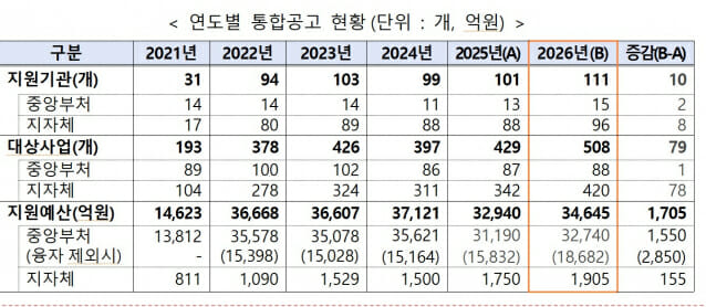 중소벤처기업부(장관 한성숙, 이하 중기부)는 19일 총 3조 4645억원 규모의 '2026년 중앙부처 및 지자체 창업지원사업 통합공고'를 했다고 밝혔다. 이번 창업지원사업 통합공고에는 111개 기관의 총 508개 창업지원사업이 포함됐다. 2026년 전체 예산은 3조 4645억원으로 전년(3조 2940억원) 대비 1705억원(5.2%)이 증가했다.. 중기부는 창업기업 및 예비창업자에게 창업지원사업 정보를 알기 쉽게 제공하기 위해 2016년부터 창업지원사업을 통합 공고하고 있다. 내년에는 중앙부처의 5개 보증사업(비예산)을 신규로 포함했다. 사업 유형별 현황 지원사업을 융자·보증, 기술개발 등 지원 유형별로 살펴보면 융자가 1조 4245억원(17개 사업)으로 가장 높은 비중(41.1%)을 차지했다. 이어 기술개발 8648억원(25.0%), 사업화 8151억원(23.5%) 순으로 많은 예산이 배정됐다. 이들 3개 유형의 예산이 전체 89.6%를 차지했다. 기관별 현황 중앙부처는 중기부, 과기부 등 15개 부처가 88개 창업지원사업을 추진하며, 규모는 3조 2740억원이다. 이 중 중기부가 3조 734억원으로 중앙부처 전체의 93.9%를 차지했다. 이어 과기정통부(846억원), 문체부(400억원), 농식품부(317억원) 순이다. 특히, 금융위와 산림청이 내년부터 처음으로 창업지원사업 공고에 참여했다. 금융위는 창업기업 보증사업 등 4개 사업(비예산)을 지원하고, 산림청은 청년 산림창업 마중물 지원 사업에 6억원의 예산을 투입해 산림분야 창업자 16명을 지원할 예정이다. 지방자치단체(광역 17개, 기초 79개)는 서울(390억원), 경남(197억원), 경기(192억원) 등에서 총 1905억원, 420개 사업을 추진한다. 서울시는 4개 창업허브(115억원)를 통해 사무공간 제공과 투자연계 네트워킹 등을 지원하고, 인천시는 기업수요 맞춤형 기술개발사업(48억원)으로 투자자가 발굴한 기업의 기술개발을 지원한다. 전북도는 농생명분야 대표 기업 육성 사업(20억원)을 통해 농식품기업의 성장단계별 프로그램을 운영할 계획이며, 대전시는 지난해 9월에 개소한 재도전혁신캠퍼스(6억원)를 운영함으로써 실패를 자산화하는 재도전을 응원한다. 주요 창업지원사업 현황 기술개발: 기술개발(R&D) 사업 예산은 전년대비 2356억원 증가한 8648억원이다. 중기부는 '창업성장기술개발' 사업을 통해 7864억원(전년대비 1904억원 증액)을 투입해, 업력 7년 이하 창업기업 약 1668여개사에 최대 3년간 15억원의 기술개발비를 출연 지원할 계획이다. 과기정통부는 '공공기술기반 시장연계 창업탐색지원(326억원, 247개 실험실 지원)', '실험실 특화형 창업선도대학 사업'(148억원, 153개 실험실 지원) 등 대학․연구기관 연구원 창업과 AX혁신기업창의기술개발 사업('26년 신규, 75억원, 27개 과제 지원)으로 반도체·디스플레이, 이차전지 등 12대 전략 기술개발 분야와 AX 제품 서비스 분야 기술개발에 전년대비 396억원 증가한 708억원을 지원한다. 사업화: 사업화 예산은 전년대비 485억원 증가한 8151억원이다. 중기부는 예비·초기·도약 패키지 사업예산을 전년대비 240억원 증액된 1778억원으로 편성, 성장 단계에 맞춘 사업화 자금과 AI 교육훈련 등 창업 프로그램을 지원한다. 초격차 스타트업 프로젝트(1456억원)를 통해 신산업 분야에서 스타트업의 혁신성장과 해외시장 진출을 지원한다. 문체부는 내년부터 관광 오픈이노베이션 프로그램을 신설해 30억원의 예산으로 관광 분야 창업기업 30여개사를 선정, 관광 맞춤형 사업실증비, 투자유치 등을 지원한다. 청년: 청년을 지원하는 사업 예산도 전년대비 801억원 증가한 2575억원이다. 주요 사업으로는 중기부 청년창업사관학교(1025억원), 창업중심대학(883억원), 경북 예비창업발굴 육성지원(23억원), 충남 청년 창업·창직 지원사업(10억원) 등이 있다. 관리 지침 개편...집행 가능 사업비 범위 확대하고 페널티는 강화 한편 중기부는 2026년 창업지원사업 통합공고와 함께, 중기부는 '창업지원사업 관리지침' 개편을 통해 창업기업이 혁신 성장할 수 있는 기반을 마련하고, 합리적이고 투명한 창업생태계를 조성해 나갈 예정이다. 먼저, 창업기업의 자금 유동성을 높이면서, 신속한 사업화 추진이 가능하도록 집행이 가능한 사업비 범위 확대를 추진한다. 외주용역비는 사업완료 후 일시납 원칙에서 벗어나 유연하게 분할 지급할 수 있도록 방식을 변경하고, 사업 참여기간 내 발생한 지식재산권 비용만 지원하던 방식에서 사업 전에 출원한 지식재산권 유지 비용까지 지원 대상에 포함된다. 더불어, 창업기업의 기술 보호 역량 강화를 위해 '기술 침해 소송보험료' 지급이 가능하도록 개편할 예정이다. 창업지원사업에 선정된 이후 거짓·부정 행위에 대한 참여 제한 기간을 강화하고, 정부지원금으로 구매한 기자재에 대한 관리체계 개편을 추진한다. 거짓·부정한 방법으로 사업비를 교부받거나 사업에 참여하는 경우, 기존 3년 참여 제한에서 5년으로 참여 제한을 변경하고, 정부 지원사업 수행이 완료된 이후에도 정부지원금으로 구축한 장비 운영·관리에 대한 관리 체계를 강화할 예정이다. 조경원 창업정책관은 “창업을 준비중이거나 창업한 분들이 이번 통합공고 사업을 활용해 기업 성장과 일자리 창출을 이루고, 국