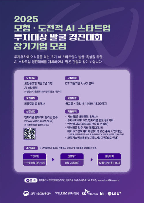 과학기술정보통신부는 혁신적인 기술력에도 투자유치에 어려움을 겪어온 초기 단계 AI 스타트업을 지원하기 위해 '모험 도전적 AI 스타트업 투자대상 발굴 경진대회'를 28일 착수한다고 밝혔다. 대회는 매출액 등 정량적 실적을 우선시했던 기존 타 대회나 투자심사 절차와 달리 기술적 우수성과 비즈니스 모델의 독창성 등 혁신성과 성장 잠재력이 핵심적인 평가 요소라는 점에서 차별된다. 한국통신사업자연합회(KTOA)가 운영하는 KIF 기반의 투자 기회 제공이 이번 대회의 중점 목표다. 특히 모험적 투자 지원 확대라는 대회 취지를 고려해 업력 3년 이내 창업 초기이거나 투자유치 실적이 없는 기업에 심사단계별 가점(2점, 104점 만점)을 부여해 그간 투자에서 소외된 기업들의 선발 가능성을 높일 계획이다. 투자유치 기업설명회(IR) 방식으로 진행될 대회는 11월11일까지 참가기업을 모집한 후 서면평가와 발표평가를 거쳐 12월18일에 개최될 최종 결선 무대에 오를 8팀을 선정할 계획으로, 결선에 진출한 팀들은 총 8천만원의 상금과 함께 투자유치 기회를 거머쥘 수 있다. 아울러 후속지원으로 투자유치 전략 수립을 위한 멘토링·컨설팅과 함께 과기정통부 지원사업 연계 혜택을 제공하고, 상위 3팀에는 KTOA에서 운영 중인 입주공간과 해외 IR 행사 참여기회 등도 제공한다. 초기 모험투자 경험을 보유한 벤처투자사(VC), 액셀러레이터(AC)를 필두로 대학기술지주, 대기업 VC(CVC), AI 기술·창업 전문가 등 다양한 분야별 전문가와 더불어 실리콘밸리 현지에서 직접 투자를 집행하고 있는 VC가 심사위원으로 참여할 예정이다. 류제명 과기정통부 차관은 “이번 경진대회는 '벤처'라는 의미를 제대로 살릴 수 있도록, 기존 벤처투자보다 더 모험적으로 투자 사각지대에 놓였던 혁신적 기업들에게 새로운 도약의 계기를 제공할 것”이라며 “앞으로도 우수한 기술력과 아이디어를 갖춘 AI 스타트업들이 도전을 이어 나갈 수 있도록 투자 환경 개선과 지원체계 고도화에 힘쓰겠다”고 밝혔다. 대회 참가 신청은 KTOA 벤터리움 홈페이지에서 할 수 있다.