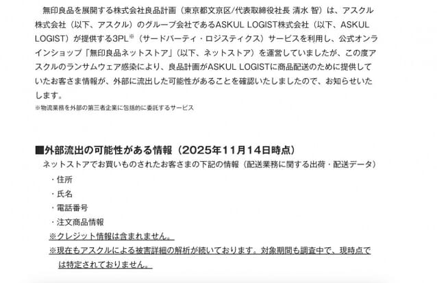무인양품 온라인스토어에서 개인정보가 유출된 것으로 나타났다. 씨넷재팬에 따르면, 아스쿨의 랜섬웨어 감염으로 무인양품이 상품 배송을 위해 해당 업체에 넘겨준 고객 정보가 외부로 유출됐을 가능성이 떠올랐다고 회사 측이 공식 발표했다. 무인양품은 온라인스토어를 운영하면서 아스쿨로지스트가 제공하는 물류 서비스를 이용해왔다. 유출 가능성이 점쳐지는 개인정보는 온라인 스토어에서 구매한 고객의 배송 업무와 관련된 출하 배송 데이터다. 주소, 이름, 전화번호, 주문 상품 정보 등이 포함된다. 현재 아스쿨 측이 피해 상세를 분석 중이며, 유출이 발생했을 가능성이 있는 기간은 조사가 진행 중이라 아직 특정되지 않았다.