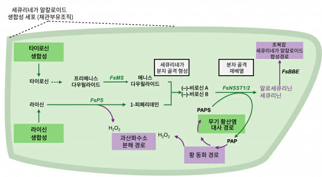 "우리나라 토종 식물인 광대싸리에서 항암 물질로 알려진 세큐리닌 생성 경로를 70년만에 찾았다. 국내 식물에서 보물지도를 찾은 것과 같다." 한순규 KAIST 화학과 교수는 전화통화에서 세큐리닌 생합성 경로를 찾은 것에 대해 이 같이 설명하며 "수년 내 대량생산도 가능할 것"이라고 조심스레 전망했다. KAIST는 생명과학과 김상규 교수 연구팀과 화학과 한순규 교수 연구팀이 우리나라 자생 식물인 광대싸리에서 항암 효과로 알려진 세큐리닌 계열 물질이 만들어지는 핵심 과정을 처음 규명했다고 6일 밝혔다. 세큐리닌은 지난 1956년 광대싸리에서 처음 발견됐다. 지금까지 130종이 넘는 관련 물질이 보고됐다. 이들 가운데 일부는 항암 효과를 보이고, 뇌로 잘 전달돼 신경 재생을 돕는 효능이 있는 것으로 알려져 있다. 다만, 이 같은 세큐리닌 효능에도 불구하고 이 성분이 세포 안에서 어떤 과정을 거쳐 합성되는지는 지난 70년간 규명되지 않은 영역이었다. 광대싸리는 한반도 원산 약용 식물로, 민간에서도 오래 전부터 잎과 뿌리를 요통 등의 치료제로 썼다. 이 식물에 세큐리닌을 비롯한 다양한 알칼로이드 성분이 있어 신약 개발 가능성이 높은 약용식물로 주목받아 왔다. 한순규 교수는 "현재 경기도 성남 불곡산에 있는 KAIST 생태림에서 대량 재배 방법 등을 연구 중"이라며 "야생식물 재배법을 연구한다고 하니, 농가에서도 처음엔 황당해 했다"고 연구 초기 당시 힘들었던 상황을 토로했다. KAIST 출신인 한 교수는 MIT에서 박사학위를 받은 뒤 예일대학을 거쳐 지난 2014년부터 KAIST 교수로 재직해왔다. 한 교수는 "항암 성분 세큐리닌이 생성되는 전 과정을 처음 밝혀낸 것으로, 실험실과 미생물 공장에서 항암 물질을 안정적으로 생산할 수 있는 길이 열렸다"며 "특히, 화학과 생명과학의 협력이 핵심 역할을 했다"고 강조했다. 세큐리닌 계열 물질의 화학적 합성을 오랫동안 연구해 온 한순규 화학과 교수 연구팀과, 식물 유전체 분석과 단일세포 분석에 강점을 가진 김상규 생명과학과 교수 연구팀의 공동 연구 합작품이기 때문이다. 김상규 교수 연구팀은 'KAIST 생태림'에서 광대싸리를 확보해 연구 시료를 만들고, 식물 유전체를 정밀 분석했다. 특히 세큐리닌 생성이 활발한 잎 조직을 대상으로 단일세포 전사체 분석을 수행해, 어떤 세포에서 어떤 유전자가 작동하는지를 세밀하게 추적했다. 한순규 교수 연구팀은 세큐리닌이 만들어지기 바로 전 단계 물질이 '비로신 B'라는 것을 처음 확인하고, 이를 실험실에서 직접 만들어 변화를 관찰했다. 그 결과, 식물 속 효소인 '황산전이효소'가 비로신 B를 항암 성분 세큐리닌으로 바꾸는 데 핵심적인 역할을 한다는 사실을 밝혀냈다. 황산전이효소가 단순히 화학 성분을 붙이는 보조 역할이 아니라, 알칼로이드의 구조 자체를 바꾸는 데도 중요한 역할을 할 수 있음을 처음으로 보여준 연구 결과다. 연구팀은 이 연구를 위해 광대싸리 유전자 지도를 제작하고, 단일세포 전사체 분석을 통해 유전자 발현 패턴을 고해상도로 분석했다. 한순규 교수는 "용해도를 높이거나 물질 분해를 촉진하는 것으로 여겨졌던 황산전이효소가 알칼로이드 분자 골격의 재배열을 매개하는 최초 사례"라며 "황산전이효소의 새로운 역할을 발견해냈다는 의의가 있다"고 설명했다. 이 때 얻어진 두 개의 유전자에 각각 'FsNSST1/2'이라는 이름도 명명했다. 연구팀은 "모든 생합성 유전자들이(티로신, 라이신 등) 광대싸리 잎 관다발세포군(체관부유조직)에서 집중적으로 발현됐다"며 "이는 이차대사물질 생합성 경로상의 핵심 유전자뿐만 아니라, 이차대사물질 생합성을 보조하는 유전자 또한 유기적으로 연계디어야 함을 시사한다"고 부연설명했다. 김상규 교수는 "우리나라 자생 식물에서 얻을 수 있는 고부가가치 천연물이 어떻게 만들어지는지를 분자 수준에서 밝힌 것”이라며 “미생물이나 세포를 이용해 항암 물질을 안정적으로 생산하고, 다양한 의약학적 응용으로 이어질 수 있는 기반을 마련했다”고 말했다. 연구에는 KAIST 정성준 박사후연구원, 강규민 박사후연구원, 김태인 석박통합과정생이 공동 제1저자로 참여했다. 연구 성과는 국제 학술지 네이처 커뮤니케이션즈(Nature Communications, IF 15.7, 1월 23일자)에 게재됐다. 연구는 과기정통부/한국연구재단 중견 연구자 관련 사업, 농촌진흥청 NBT사업단 차세대농작물신육종기술개발 사업, KAIST 생태연구프로그램 지원을 받았다.