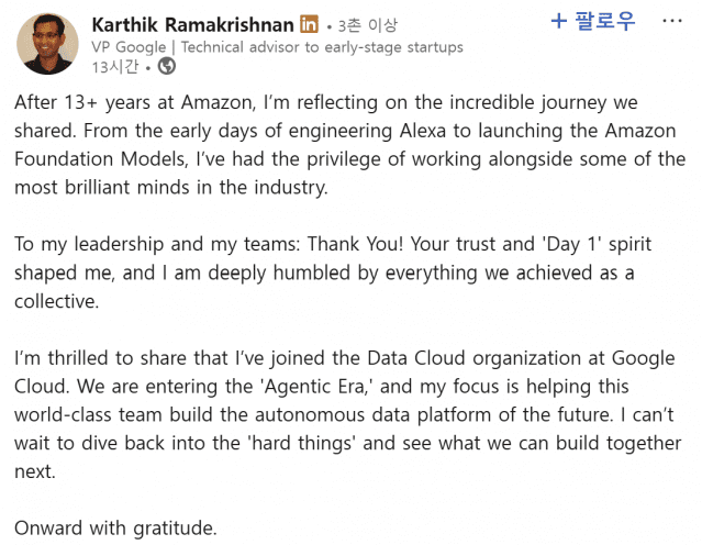 구글 클라우드가 아마존에서 인공지능(AI) 전략과 파운데이션 모델 개발을 이끌었던 핵심 인재를 영입하며 AI 에이전트 강화에 박차를 가한다. 미국 IT 미디어 긱와이어에 따르면 구글 클라우드는 아마존에서 14년간 근무하며 AI 전략 수립과 기술 개발을 주도한 카르틱 라마크리슈난을 데이터 클라우드 조직 부사장(VP)으로 선임했다. 라마크리슈난은 아마존의 음성 AI 서비스 '알렉사' 초기 개발에 참여했으며 최근에는 자체 파운데이션 모델 '노바' 개발을 이끈 인물로 알려졌다. 라마크리슈난 부사장은 2012년 아마존에 합류한 이후 대화형 AI부터 멀티모달 범용인공지능(AGI)에 이르기까지 아마존 AI 기술 진화 전반에 관여한 것으로 평가된다. 아마존 합류 이전에는 마이크로소프트(MS)가 텔미 네트웍스를 인수한 후 3년간 수석 플랫폼 엔지니어로 근무한 바 있다. 이번 인사는 아마존 내부 AI 조직 개편과 맞물려 이뤄졌다. 최근 아마존에서는 AI 조직을 이끌던 로히트 프라사드 수석부사장이 회사를 떠났다. 앤디 재시 아마존 최고경영자(CEO)는 AI 모델 연구팀과 맞춤형 실리콘, 양자 컴퓨팅 조직을 통합하는 새로운 체제를 발표했다. 아마존은 지난해 말 '노바 2' 모델을 공개하며 경쟁사 추격에 나선 상태다. 빅테크 업계에서는 AI뿐 아니라 최고위 임원급 인재 이동이 이어지고 있다. 메타는 MS 출신 법무 책임자를 최고법률책임자(CLO)로 영입하는 등 주요 기업 간 인재 확보 경쟁이 더욱 치열해지는 양상이다. 라마크리슈난 부사장은 링크드인을 통해 "우리는 에이전트 시대에 진입하고 있다"며 "세계적 수준의 팀과 함께 미래 자율 데이터 플랫폼을 구축하는 데 집중할 것"이라고 밝혔다.