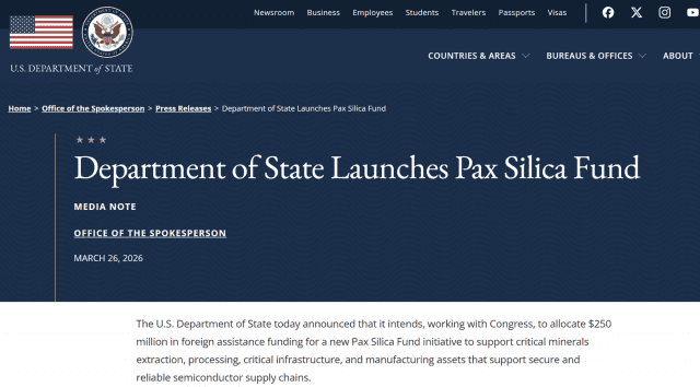 미국 국무부가 자국 내 반도체 공급망 강화를 위한 '팍스 실리카(Pax silica)' 펀드를 출범한다고 26일(현지시간) 발표했다. 미국은 해당 펀드에 2억 5000만 달러(약 3700억원) 대외 원조 자금을 배정할 예정이다. 국무부는 "팍스 실리카는 공급망의 모든 단계에 걸쳐 전략 파트너십과 협력적 조치를 제공한다"며 "이 기금이 평균 1조 달러 이상 자산을 보유한 대규모 국부펀드와 민간 자본을 유치할 것으로 기대한다"고 밝혔다. 앞서 도널드 트럼프 미 행정부는 지난해 12월 반도체 제조용 핵심광물의 공급망 안정화를 위해 팍스 실리카라는 안보 협력체를 출범시킨 바 있다. 초기 한국과 일본, 싱가포르, 영국, 인도, 호주 등 8개국이 연합체에 합류했다. 가입국은 추가되고 있다. 팍스 실리카 참여국은 핵심광물과 반도체 설계·제조·패키징 등에서 공급망 취약성을 공동 점검하고, 이를 해결하기 위한 프로젝트를 추진할 계획이다. 이는 반도체·인공지능(AI) 등 첨단 산업 굴기에 적극 나서는 중국을 견제하기 위한 목적이라는 분석이 나온다. 현재 중국은 반도체 등 다양한 첨단 산업의 핵심 소재인 희토류 공급을 90%가량 장악하고 있다. 제이컵 헬버그 미 국무부 경제성장·에너지·환경 담당 차관은 "팍스 실리카 연합체의 투자 규모는 1조 달러 이상이 될 것"이라며 "일본 소프트뱅크, 싱가포르 테마섹 등이 창립 멤버가 될 것"이라고 말하기도 했다.