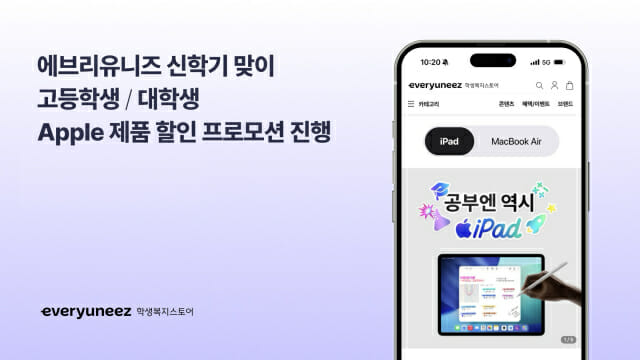 Z세대 전문 커머스플랫폼 '에브리유니즈'가 새 학기를 맞아 애플 주요 제품을 대상으로 'BTS(Back to School)' 할인 행사를 진행한다고 9일 밝혔다. 이번 행사는 매년 신학기에 진행하는 대규모 할인 행사로, 대학생과 고등학생(2008년~2010년생)을 대상으로 3월28일까지 운영된다. 행사 기간 동안 ▲iPad Air 11”(M3) ▲iPad Air 13”(M3) ▲MacBook Air 13”(M4) ▲Apple Pencil Pro ▲Magic Keyboard 등 주요 제품 5종을 최대 21% 할인된 가격에 판매한다. 실제 혜택 적용 시 iPad Air는 74만9천원부터, iPad는 44만9천원부터 구매할 수 있다. 또 전자기기를 안심하고 사용할 수 있도록 돕는 'Apple Care+'도 에브리유니즈 애플 브랜드관에서 30% 할인된 가격에 제공한다. 이 행사는 온·오프라인에서 동시에 진행된다. 온라인은 에브리유니즈 내 애플 브랜드관에서 구매 가능하며, 오프라인은 에이샵, 프리스비, 아이스토어, 에이스토어, 롯데하이마트 매장에서 직접 제품을 확인하고 구매할 수 있다. 에브리유니즈는 국내 대학생활 플랫폼인 '에브리타임'과 연동돼 있어 대학생 사용자는 간편하게 로그인할 수 있다. 오프라인 매장에서도 에브리유니즈 학생 인증 페이지를 직원에게 제시하면 즉시 할인이 적용된다. 고등학생은 휴대폰 본인 인증을 거쳐 에브리유니즈 가입 후 참여 가능하다.