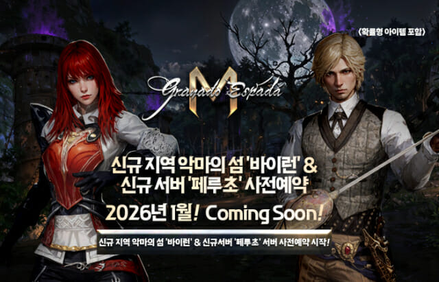 한빛소프트(대표 원지훈)는 모바일 MMORPG '그라나도 에스파다M'의 신규 지역 '바이런 섬'과 신규 성장 서버 '페루초' 사전예약을 진행한다고 9일 밝혔다. 신규 지역과 성장 서버는 1월 중 업데이트 예정이며, 사전예약은 이달 8일부터 업데이트 전까지 공식 홈페이지를 통해 신청할 수 있다. 이번 사전예약에 등록한 모든 이용자에게는 전설 등급 이벤트 펫 '눈꽃 토이 샤샤'를 지급한다. 아울러 ▲찬란한 앙드레의 상자 3개 ▲기간제 도감 아이템 1개(공격력 +5) ▲스페셜 코스튬 티켓 6장 ▲끌로드 설계도 선택상자 3개 등 보상도 업데이트 시점에 우편함으로 제공한다. 신규 및 복귀 가문을 위한 지원 이벤트도 진행된다. 이 행사를 통해 경험치 획득량 +400% 버프, 기간제 +7강 신화 장비 풀세트, 소환권 선택상자를 지급한다. 신규 가문에는 '푸른 불꽃 루딘'과 '폭주검사 라발'을 추가로 제공한다. 신규 지역 바이런 섬은 어둡고 음산한 분위기의 숲과 몬토로 자작이 살고 있는 루치페르 성이 위치한 지역이다. 카스티야 시나리오를 완료해야 진입할 수 있으며, 새로운 필드보스와 몬스터가 등장한다. 또한 이 지역에서는 새로운 메인 및 임무 퀘스트가 제공되고, 신규 무료 영입 캐릭터와 소장 캐릭터를 가문에 추가할 수 있다. 신규 서버 페루초에도 전용 혜택과 이벤트가 진행된다. 이 서버에서는 서버 오픈 후 35일간 경험치 2배, 비스 3배, 아이템 드랍률 3배 혜택이 적용된다. 1일 1회 소환권과 모래시계 선택상자 등도 지급되며 프리미엄 던전 '리온' 내 드랍률 2배 증가 혜택도 제공한다. 아울러 기간떼 지역 퀘스트 선착순 이벤트를 진행한다. 가장 빠르게 완료한 이용자 중 1등부터 5등까지 총 150만 페소를 지급할 예정이다. 또한, 신규 서버 전용 이벤트로 기간떼 지역 퀘스트를 가장 빠르게 완료한 유저 중 1등부터 5등까지 총 150만 페소를 지급하는 경쟁 이벤트도 진행될 예정이다. 그라나도 에스파다M 관계자는 “2026년 1월 첫 업데이트는 PC원작 그라나도 에스파다에서도 매우 중요한 지역이었던 바이런 섬 지역을 업데이트로 준비했다"라며 "이번 신규 지역인 바이런 섬을 미리 준비할 수 있도록 사전 예약에 참여하셔서 보상 및 혜택을 받아 가시기 바란다"라고 전했다.