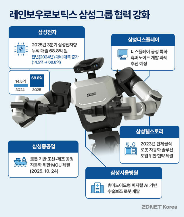 삼성그룹이 전 계열사 차원에서 로봇·휴머노이드 활용과 도입을 빠르게 확대하고 있다. 제조·의료·조선·급식 등 그룹 핵심 사업 전반에 로봇 자동화 도입을 추진하며, 자회사인 레인보우로보틱스를 적극 활용하는 모습이 뚜렷하다. 삼성전자는 레인보우로보틱스 투자 이후 매년 발주량을 늘리고 있다. 레인보우로보틱스 공시에 따르면 올해 3분기까지 삼성전자에 납품한 제품 규모는 누적 68억8천만원으로 집계됐다. 이는 2분기 누적 19억2천만원 대비 가파른 증가이며, 작년 연간 14억5천만원과 비교하면 약 374% 증가했다. 삼성전자는 작년 말 레인보우로보틱스 최대주주로 오르면서 대표이사 직속 미래로봇추진단을 신설했다. 미래로봇추진단은 휴머노이드를 포함한 미래로봇 기술 개발에 집중하는 조직이다. 레인보우로보틱스 창업 멤버이자 카이스트 명예교수인 오준호 교수가 삼성전자 고문 겸 미래로봇추진단장을 맡고 있다. 삼성디스플레이는 휴머노이드 맥스(M.AX) 얼라이언스 내에서 레인보우로보틱스와 함께 디스플레이 공정 특화 휴머노이드 개발 과제를 추진할 예정이다. 초정밀 패널 공정에서 사람이 아닌 휴머노이드가 직접 공정 참여가 가능한지 검증하는 연구다. 삼성디스플레이 로봇 투입 전략의 실질적 시범 프로젝트로 평가된다. 삼성중공업은 지난달 레인보우로보틱스와 조선·제조 공정 자동화 협력 업무협약(MOU)을 체결하며 로봇 기반 '스마트 조선소' 구축에 속도를 내고 있다. 협동로봇·이동형 양팔로봇·4족로봇을 적용한 자동화 시스템을 개발하고, 로봇 기술 검증 및 현장 테스트, 생산성 향상 공정 실증 등에 협력할 계획이다. 삼성서울병원은 보건복지부가 추진하는 '2025년 제1차 한국형 ARPA-H 프로젝트' 1단계 수행기관으로 레인보우로보틱스와 함께 선정됐다. 피지컬 AI 기반 휴머노이드형 수술보조 로봇을 개발하고 있다. 수술실에서 반복적·정밀 작업을 수행하는 양팔 로봇으로 의료진의 수술 맥락을 실시간 이해·예측하는 자율 보조 기능 확보가 목표다. 삼성웰스토리는 2023년 레인보우로보틱스와 협약을 체결하고 단체급식 영역의 로봇 자동화를 추진 중이다. 기존 '웰리봇' 조리로봇에 더해 대량 급식 조리에 최적화된 로봇팔 솔루션을 공동 개발, 실제 사업장 도입을 확대하고 있다. 한편 삼성 내부에서도 로봇 사업을 차세대 전략 축으로 격상시키는 움직임이 뚜렷하다. 최근 연말 정기 임원 인사에서 로봇 인공지능과 로봇 플랫폼 개발을 맡는 핵심 리더들을 잇따라 중용하며 역량 강화에 드라이브를 걸었다. 미래로봇추진단에 합류한 권정현 부사장과 자율주행·조작 소프트웨어 전문가인 최고은 상무가 대표적이다. 업계에서는 이 같은 삼성 내부 조직 개편이 계열사별 로봇 도입 확대와 맞물리며 레인보우로보틱스와의 협력에도 일종의 전사적 시너지를 형성하고 있다는 분석을 내놓고 있다. 삼성이 로봇 연구개발(R&D)부터 현장 적용, 향후 투자·제휴까지 생태계를 통합적으로 구축하려는 그룹 차원의 움직임이 더욱 뚜렷해졌다는 평가다.