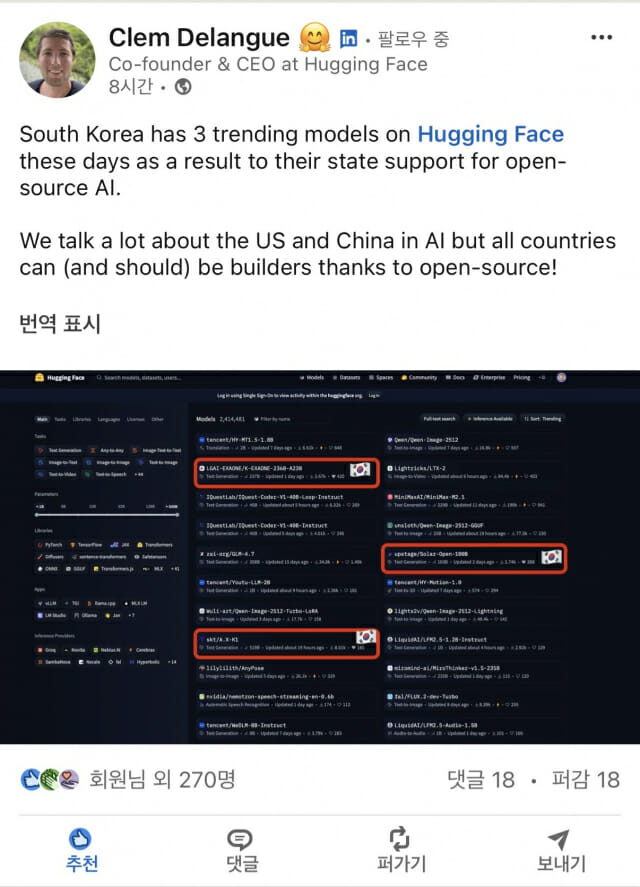 국내 기업들이 개발한 인공지능(AI) 모델이 글로벌 오픈소스 생태계에서 경쟁력을 입증했다. 8일 클렘 들랑그 허깅페이스 공동창업자 겸 최고경영자(CEO)는 "한국이 허깅페이스 인기 오픈소스 AI 모델 상위권을 다수 보유하고 있다"고 링크드인 게시물을 통해 밝혔다. 들랑그 CEO가 공개한 화면에는 LG AI연구원 'K-엑사원 236B-A23B' 모델이 국내 모델 중 가장 높은 순위에 올랐다. SK텔레콤 '에이닷엑스(A.X.) K1'과 업스테이지 '솔라 오픈 160B'이 뒤를 이었다. 특히 LG AI연구원의 K-엑사원은 글로벌 오픈소스 모델과 동일한 인기 지표 선상에서 상위권을 차지하며 존재감을 드러냈다. 한국 AI 모델이 단순 참여 수준을 넘어 실질적인 경쟁 모델로 평가받고 있다는 의미로 해석된다. 들랑그 CEO는 해당 게시물에 글로벌 인기 모델 목록 화면을 캡처해 공유하며 태극기 이미지도 게시했다. 이 같은 성과는 정부가 추진 중인 '모두를 위한 AI' 기조와도 맞닿았다. 정부는 AI 모델을 오픈소스로 개발해 국내외에서 활용할 수 있도록 하는 '독자 AI 파운데이션 모델' 프로젝트를 진행 중이며, 들랑그 CEO가 언급한 세 모델 모두 이 프로젝트에 참여하고 있어서다. 해당 소식에 국내 업계 반응도 이어졌다. 들랑그 CEO는 "우리가 AI 분야에서 미국과 중국에 대해서만 주로 논의했다"며 "오픈소스 덕분에 모든 국가가 AI 생태계 건설자가 될 수 있으며 그렇게 돼야 한다"고 설명했다.