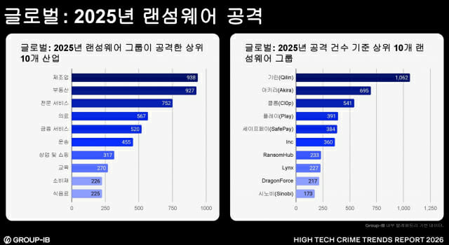 작년에 세계적으로 랜섬웨어 공격을 가장 많이 한 그룹은 킬린(Qilin)으로 나타났다. 또 산업별로는 제조업이, 아시아태평양 지역에선 인도가 가장 많이 공격을 받았다. 디지털 범죄 조사, 예방 및 대응을 위한 사이버 보안 기술 전문 글로벌 기업 그룹아이비(Group-IB, 한국지사장 김기태)는 13일 잠실 롯데 시그니엘 76층 스튜디오에서 '2026년 하이테크 범죄 동향 보고서(High-Tech Crime Trends Report 2026)'를 발표, 이 같은 사실을 공개했다. 보고서에 따르면 킬린은 작년 한해 1062건의 사이보 공격을 감행, 가장 많은 공격 건수를 기록했다. 2위는 아키라(Akira)로 695건, 3위는 클롭(ClOp, 541건), 4위는 플레이(Play, 391건), 5위는 세이프페이(SafePay, 384건)였다. 이어 6위 Inc(360건), 7위 랜섬허브(RansomHub, 233건), 8위 린스(Lynx, 227건), 9위 드래건포스(DragonForce, 217건), 10위 시노비(Sinobi, 173건)로 집계됐다. 또 공격을 많이 받은 산업군 톱10은 제조업이 1위(938건)였고 2위 부동산(927건), 3위 전문서비스(752건), 4위 의료(567건), 5위 금융서비스(520건), 6위 운송(455건), 7위 상업 및 쇼핑(317건), 8위 교육(270건), 9위 소비재(226건), 10위 식음료(225건)로 조사됐다. 이밖에 그룹아이비에 따르면, 아시아태평양 국가중 작년 한해 랜섬웨어 그룹 공격을 가장 많이 받은 지역은 인도가 138건으로 가장 높았다. 인도에 이어 호주(132건), 일본(69건), 태국(63건), 싱가포르(59건), 한국(58건), 대만(57건), 말레이시아(46건), 인도네시아(35건), 중국(30건) 순으로 랜섬웨어 공격을 받았다. 한편 랜섬웨어 추적 사이트 '랜섬웨어닷라이브'에 따르면 작년 세계 랜섬웨어 피해 건수는 8천159건으로 최근 3년래 최고치였다. 국가별로는 미국이 3220곳으로 최다였고 이어 캐나다, 독일, 영국 순으로 많았다.