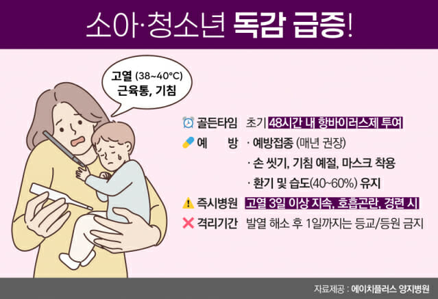 최근 기온 변화와 실내 생활 증가로 소아 청소년층을 중심으로 감염이 빠르게 확산하고 있다. 현재 국내 독감 유행은 영유아~청소년 중심으로 빠르게 확산, 7세~12세와 1세~6세에서 환자 비율이 가장 높다. 독감뿐 아니라 RSV 등 다른 호흡기 질환도 동시에 유행하고 있어 겨울철에는 '바이러스 2~3중 위협'이 현실화하고 있다. 독감은 인플루엔자 A·B형 바이러스에 의해 발생하는 급성 호흡기 감염병이다. 고열과 오한, 근육통, 두통 등 전신 증상이 나타나는 것이 특징이다. 영유아는 탈수, 구토, 식욕저하, 보채기가 동반될 수 있으며 고열이 3일 이상 지속되거나 호흡곤란, 청색증, 경련이 나타나면 즉시 진료가 필요하다. 소아는 성인보다 면역력이 약해 고열, 탈수, 폐렴, 중이염 등 합병증이 더 쉽게 발생할 수 있으며, 집단생활을 통해 전염력이 폭발적으로 증가하는 경향이 있다. 항바이러스제 투여 외에 해열제와 진통제 등 대증 치료를 시행하며 고열로 인한 탈수를 방지하기 위해 물과 수분 보충 음료를 자주 섭취해야 한다. 회복과 2차 감염을 막기 위해 충분한 휴식과 함께 발열이 사라진 뒤 1일 정도는 등교와 등원을 삼가야 한다. 보통 독감의 잠복기는 1일~4일이며, 갑작스러운 고열, 호흡기 증상, 심한 피로감과 근육통, 식욕저하, 구토와 설사 등 증상이 나타나면 독감을 의심해야 한다. 특히 고열이 3일 이상 지속되거나 호흡곤란, 지속적인 구토, 발작이 동반되면 병원 진료를 받아야 한다. 소아는 인플루엔자 합병증 고위험군에 속한다. 매년 독감 백신 접종이 권장되며 접종 후 항체 형성에는 약 2주가 필요해 유행 전 접종이 효과적이다. 예방을 위해서는 손 씻기와 기침 예절 등 기본 위생 수칙을 실천하고 건조한 환경은 바이러스 확산을 돕기 때문에 주기적 환기와 40~60% 습도 유지가 필요하다. 단체 생활 시 가급적 마스크 착용을 권장하며 충분한 수분 공급과 균형 잡힌 식단도 중요하다. 에이치플러스 양지병원 소아청소년과 양무열 전문의는 “최근 소아 독감 환자가 증가하고 있고, 영유아는 탈수와 폐렴 등 합병증 위험이 커 증상 초기부터 세심한 관리가 필요하다”라며 “독감은 예방접종과 기본 위생 수칙 실천으로 상당 부분 예방이 가능하고 증상 발생 초기 48시간 내 항바이러스제 치료가 회복을 앞당기는 핵심”이라고 강조했다.
