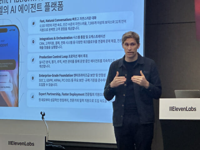 "앞으로 자동차, 가전제품 등 모든 기기가 사람이 말하는 방식·감정을 완전히 이해할 것입니다. 우리는 한국을 포함한 전 세계 어디서든 실시간으로 번역·더빙 가능한 '보이스 인텔리전스 환경'을 구축할 것입니다." 마티 스타니셰프스키 일레븐랩스 공동 창업자 겸 최고경영자(CEO)는 21일 서울 JW메리어트호텔에서 기자간담회를 열고 한국 시장 진출 소식을 알리며 이같이 밝혔다. 일레븐랩스는 AI 음성 생성 기업이다. 음성 합성, 오디오 처리 등 인간과 유사한 상호작용을 구현하는 모델을 운영하고 있다. 텍스트-투-스피치(TTS), 스피치-투-텍스트(STT), AI 더빙, 보이스 클로닝, 사운드 효과, 음성 분리, 일레븐뮤직 등 여러 분야에서 기술력을 확장했다. 현재 글로벌 기준 월간 활성 사용자수 5천만명, 기업 가치 66억 달러를 보유하고 있다. 포춘 500대 기업 중 75%가 고객사로 참여하고 있으며, 국내에서는 이스트, 크래프톤, 네이버 등이 주요 고객사다. 이날 스타니셰프스키 CEO는 API 파운데이션을 비롯한 크리에이티브 플랫폼, 에이전트 플랫폼 등 3단 구조 서비스 모델을 제시했다. 이중 핵심 제품은 에이전트 플랫폼이다. 이 플랫폼은 0.5초 미만 응답 속도와 7천 개 이상의 보이스, 32개 언어를 지원한다. 고객관계관리(CRM)와 고객지원, 결제, 전화 시스템 등 다양한 엔터프라이즈 워크플로와 연결돼 전환율 향상과 매출 증가를 돕는다. 실시간 분석·평가·추적 기능도 갖췄다. 주요 보안·규제 기준을 충족하는 구조로 구축돼 엔터프라이즈급 안정성을 유지한다. 스타니셰프스키 CEO는 앞으로 AI 음성 분야는 더 확장할 것이라고 주장했다. 그는 "모든 디바이스가 인간 발화법까지 이해하는 보이스 인텔리전스가 될 것"이라며 "언어 장벽까지 완전히 없애 실시간 번역·더빙 환경을 구축할 것"이라고 내다봤다. 이어 "AI가 맥락 이해와 감정 반응까지 가능할 전망"이라며 "에이전트가 다양한 접점에서 일관된 상호작용을 제공하게될 것"이라고 덧붙였다. 스타니셰프스키 CEO는 기업공개(IPO)도 계획 중이라고 밝혔다. 그는 "그동안 5년 내 IPO를 목표로 세웠지만 서비스 성과가 예상보다 잘 나오고 있다"며 "현재 3년 내 IPO를 할 수 있을 것으로 보고 있다"고 내다봤다.