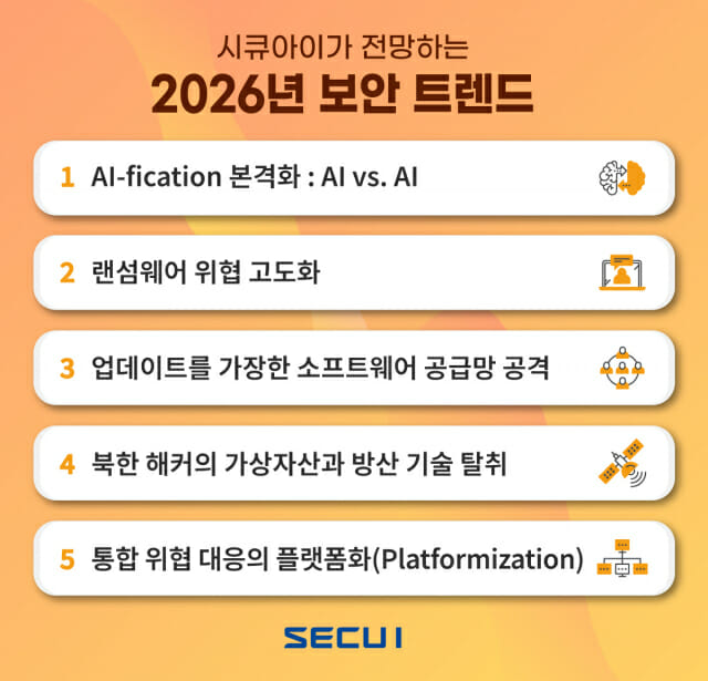 시큐아이가 내년 부상할 주요 사이버 위협으로 랜섬웨어, 인공지능(AI) 등을 꼽았다. 시큐아이는 17일 '2026년 보안 트렌드'를 5가지로 요약해 발표했다. 구체적으로 ▲AI vs AI ▲랜섬웨어 위협 고도화 ▲업데이트를 가장한 소프트웨어 공급망 공격 ▲북한 해커의 가상자산과 방산 기술 탈취 ▲통합 위협 대응의 플랫폼화 등이다. 우선 시큐아이는 내년부터 공격과 방어 전반에 AI가 확산되며, 사이버 보안이 본격적인 'AI vs AI' 구도로 전환될 것으로 예상했다. 생성형 AI의 확산으로 딥페이크, 맞춤형 악성코드 등 공격이 지능화·자동화되고 있어 기존 위협의 수준이 단기간에 높아졌다고 봤다. 이에 향후 AI가 자율적 판단과 실행 능력을 갖춘 '공격 에이전트'로 변모할 것이라는 예측이다. 이에 대응하기 위해 시큐아이는 보안 솔루션과 서비스에도 AI 도입이 빠르게 확산되고 있다고 밝혔다. 특히 AI가 스스로 목표를 설정하고 대응 전략을 수립해 인간 개입 없이 보안 업무를 수행하는 'AI 기반 보안 플랫폼'이 더욱 주목받을 예정이다. 올해 국내 기업 및 기관을 괴롭혔던 랜섬웨어 공격 역시 내년에도 계속될 전망이다. 특히 정보를 암호화하고 기업에 돈을 요구하는 기존 랜섬웨어 공격에서 나아가 주요 랜섬웨어 그룹들은 다크웹에 탈취 정보를 공개하며 피해 기업을 공개적으로 압박하는 등 대담한 방식으로 운영되고 있다. 최근에는 암호화 해제 비용을 지불한 이후에도 데이터 유출을 빌미로 추가 협박을 가하고, DDoS 공격까지 병행하는 등 이중·삼중의 갈취 수법이 활개를 치고 있다. 또 공공·금융기관에 납품되는 보안 솔루션이나 필수 소프트웨어의 업데이트 서버가 해킹될 경우 악성코드가 대규모로 유포될 수 있으며, 이는 단일 기관을 넘어 여러 기관에 연쇄적인 피해를 초래할 수 있다고 우려했다. 공공·금융기관에서 클라우드 전환, AI 도입을 가속화하고 있는 만큼 소프트웨어 업데이트 검증 절차를 더욱 엄격히 점검해야 한다고 당부했다. 국가 배후 공격 세력의 가상자산과 방산 기술 탈취 시도도 내년에 이어질 전망이다. 경제제재로 외화 사정이 어려워진 북한은 최근 수년 동안 가상자산 해킹을 통한 외화 취득에 상당 부분 의존하고 있기 때문이다. 한편 보안 산업의 트렌드는 탐지·분석·대응 전 과정을 단일 환경에서 처리하는 '플랫폼화' 흐름이 본격화될 전망이 나온다. 구체적으로 AI, 위협 인텔리전스(TI), SIEM·SOAR를 하나의 환경으로 통합해 위협 대응까지 수행하는 통합 위협 대응 플랫폼이 보안의 주류 모델로 자리 잡을 것으로 보인다. 시큐아이 정삼용 대표는 "보안 위협이 다방면으로 확대되는 만큼 위협 대응의 시야도 넓어져야 한다"며 "기업은 위협을 통합적으로 관리할 수 있는 보안 체계를 갖춰야한다" 말했다.