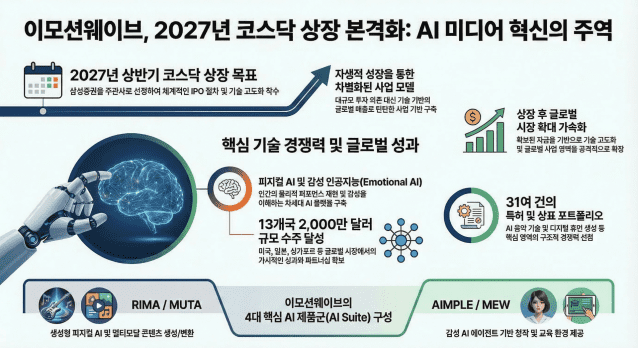 이모션웨이브가 오는 2027년 상반기 코스닥 상장을 목표로 기업공개(IPO) 준비에 본격 나선다. 이모션웨이브는 코스닥 상장을 위한 대표 주관사로 삼성증권을 선정했다고 11일 밝혔다. 지난 2013년 설립된 이모션웨이브는 피지컬 인공지능(AI)과 감성 AI 기술을 핵심 축으로 하는 AI 미디어 기업이다. 리마(RIMA)·뮤타(MUTA)·에임플(AIMPLE)·뮤(MEW) 등 4대 제품군으로 구성된 'AI 스위트(Suite)'를 통해 악기 연주·창작 재현과 멀티모달 콘텐츠 생성, 감성 AI 에이전트 서비스를 제공하고 있다. 해외 시장에선 미국·일본·중국·싱가포르·홍콩 등 주요 13개국에서 총 2000만 달러 규모의 수주 계약을 확보했다. AI 음악 기술 및 디지털 휴먼 생성 분야로 31여 건의 특허 및 상표 포트폴리오도 보유하고 있다. 이모션웨이브는 대규모 외부 투자 유치 대신 기술력을 바탕으로 한 글로벌 매출 성장을 통해 사업 기반을 구축해 왔다. 삼성증권은 이모션웨이브의 기술에 대해 "리버스 엔지니어링이 쉽지 않은 구조적 경쟁력을 갖추고 있다"며 "통합 AI 솔루션 시장의 수요를 충족할 대안이 될 것"이라고 평가했다. 이모션웨이브는 향후 상장을 통해 확보되는 자금을 기반으로 기술 고도화와 글로벌 사업 확대를 추진할 예정이다. 장순철 이모션웨이브 대표는 "피지컬 AI와 감성 AI 기술을 결합한 차세대 AI 플랫폼을 구축 중"이라며 "글로벌 AI 기업으로 성장하겠다"고 말했다.