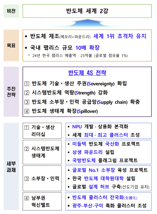 우리나라 정부 및 산·학·연 주요 관계자들이 K-반도체 경쟁력 강화를 위해 뜻을 모았다. 반도체 제조 세계 1위 초격차를 유지하고, 팹리스 규모를 10배 확장하기 위한 대대적인 전략을 수립해나갈 계획이다. 산업통상부(장관 김정관, 이하 산업부)는 관계부처 합동으로 10일 오후 용산 대통령실에서 'AI 시대, K-반도체 비전과 육성전략 보고회'를 개최하고, 우리나라가 반도체 세계 2강으로 도약하기 위한 방안을 집중 논의했다. 토론에 앞서 김정관 산업부 장관은 'AI 시대, 반도체산업 전략'을 발표하고 ▲세계 최대·최고 클러스터 조성 ▲NPU개발 집중투자 ▲상생 파운드리 설립 ▲국방반도체 기술자립 ▲글로벌 No.1 소부장 육성 ▲반도체 대학원대학 설립 ▲남부권 반도체 혁신벨트 구축에 모든 정책역량을 집중하겠다고 밝혔다. 최근 미국·일본·중국 등 경쟁국은 반도체 패권 확보를 위해 막대한 보조금, 세제·금융지원, 수출통제 등을 총동원하며, AI 시대 반도체 경쟁은 국가대항전 양상으로 전개되고 있다. 우리나라는 HBM(고대역폭메모리)을 생산하는 메모리 최강국(지난해 시장점유율 65.6%)으로서 AI 반도체 붐의 직접 수혜가 기대되나, 메모리에 집중된 산업구조로 인해 AI 확산과 함께 빠르게 성장하고 있는 시스템반도체·패키징 등 분야의 경쟁력 확보가 시급하다. 따라서 팹리스·파운드리 등 시스템반도체 경쟁력 부족, 소부장 해외 의존, 우수 인력 부족 등의 위협 요인을 해소함으로써, AI 확산을 우리 반도체산업의 성장 기회로 활용하는 동시에 구조적 취약성을 보완하여 압도적인 경쟁우위를 확보할 필요가 있다. 경쟁국이 넘볼 수 없는 반도체 초격차 기술 확보 이에 정부는 AI 반도체 기술 및 생산 리더십 확보에 나선다. HBM 이후 시장을 선도할 기술로 메모리 초격차를 유지하고, AI 특화기술 분야는 신격차를 창출한다. 절대적 강자가 없는 온디바이스 AI 반도체(NPU), PIM 등 AI 추론에 특화된 반도체에 정부 R&D를 집중 투자하고, 전력효율·피지컬 AI의 핵심부품인 화합물 반도체와 핵심 기술로 부상한 첨단 패키징(후공정) 기술개발에도 지원을 확대한다. AI 시대에 필요한 생산능력을 적기에 확충하기 위해 구축 중인 반도체 클러스터에 대한 지원은 차질 없이 이어간다. 기존 생산기반과의 연계, 전·후방 밸류체인 집적 등의 강점을 통해 글로벌 반도체 생산허브로 구축할 계획이다. 이를 위해 전력·용수 등 핵심 인프라는 국가가 책임지고 구축하고, 국비 등 공공부문의 지원을 강화한다. 시스템반도체 생태계 강화에 역량 총결집 국내 팹리스를 글로벌 수준으로 키우기 위해, 수요기업이 앞에서 끌고 파운드리가 옆에서 밀착 지원하는 협업 생태계를 조성한다. 우선 차량제어 MCU·전력관리칩 등 미들테크(middle-tech) 반도체의 국산화 지원을 통해 팹리스의 안정적인 수익 기반을 창출한다. 또한 수요기업과 팹리스가 공동으로 온디바이스AI 기술개발·상용화하는 사업에 착수하고, 팹리스 대상의 공공펀드(국민성장펀드 활용)를 조성해 IP·팹리스 간 전략적 협력에 투자한다. 미들테크 팹리스의 국내 제조 지원을 위해 민관 합동으로 국가 1호 상생 파운드리를 설립하고, 국내 팹리스 전용물량 할당, 시제품 제작 지원 등 상생 프로그램을 운영한다. 상생 파운드리는 총 4조5천억원 규모의 12인치, 40나노급 공정을 민관 합동으로 구축 검토한다. 또한 수요를 뒷받침하기 위해, 국내 처음으로 국가안보 핵심 인프라(전력망·통신망·공공데이터센터 등)를 중심으로 공공기관의 국산 반도체 우선 구매 제도 마련을 추진한다. 나아가 수입 의존도가 높은(99%) 국방반도체의 기술자립 프로젝트 출범을 통해 자주국방의 기틀을 마련한다. ▲방사청-산업부-과기부 등 관계부처 간 협업을 통한 국방반도체 全전주기(소재-설계-공정-시스템) 기술개발, ▲공공 팹 중심의 초기 양산체계 구축과 ▲민간 파운드리 역량 확대를 추진한다. 이는 내년 초 '국방반도체 국산화 및 생태계 조성방안'에서 구체적인 내용을 발표할 예정이다. K-반도체의 기초체력 소부장·인재 육성 반도체 산업의 튼튼한 버팀목, 소부장ㆍ인재 육성을 강화한다. 핵심 첨단 소부장을 ASML의 노광장비와 같이 세계 최고 수준으로 키우기 위해 '반도체 소부장 글로벌 No.1 프로젝트'를 추진한다. 세부적으로, 기술·성장잠재력을 보유한 소부장 품목·기업을 대상으로 R&D 등을 전폭 지원한다. 국내 최초로 칩 제조기업과 연계한 소부장 양산 실증 테스트베드 '트리니티팹'을 금년에 출범하고, 신속 구축(2027년 개소)한다. '트리니티팹'은 향후 소자-소부장 기업 간 공동연구 거점(한국형 IMEC)으로 확대할 계획이다. K-반도체 기초체력의 또 다른 축인 반도체 고급인력 양성도 본격 추진한다. 반도체 특성화대학원 및 반도체 아카데미를 2030년까지 단계적으로 확대하고 특성화대학의 교육과정을 내실화하는 한편, 국내 첫 '반도체 대학원대학' 설립도 추진한다. 기업이 대학원대학의 설립·운영에 직접 참여해, 반도체 밸류체인 전반(설계-SW-소자-소부장)에 걸쳐 석·박사를 양성(연간 300명 목표)할 계획이다. 지역별 반도체 아카데미·실증센터와 연계해 지방의 인력양성 