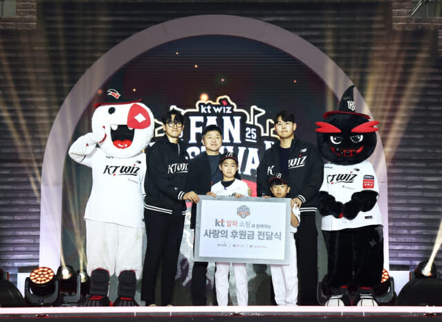KT알파 쇼핑(대표 박승표)이 kt wiz(대표 이호식), KT그룹 희망나눔재단과 함께 야구를 사랑하는 아이들의 꿈을 응원하기 위해 총 2천만원의 후원금을 마련해 베스트원야구단에 전달했다고 1일 밝혔다. KT알파 쇼핑은 2017년부터 공동 사회공헌 협약을 토대로 kt wiz 매칭 야구선수의 시즌성적에 따른 후원금을 조성하고, 프로야구경기 관람행사를 진행하는 등 다양한 경제·문화적 지원활동을 펼쳐왔다. 올해는 2025 KBO골든글러브 후보에 오른 kt wiz 에이스 투수인 고영표, 소형준 선수가 지난 2022년에 이어 다시 한번 뜻을 모았으며, 선수들의 승수당 50만원씩 적립한 후원금에 KT알파 쇼핑이 기부금을 더해 총 2천만원을 마련했다. 이와 함께 KT알파 쇼핑은 지난 11월 29일 수원컨벤션센터에서 개최된 '2025 kt wiz 팬 페스티벌'에 베스트원야구단 대표학생들 및 가족들을 초청해 '사랑의 후원금 전달식'을 진행했다. 베스트원야구단은 장애, 비장애 아동들이 함께 활동하는 유소년야구단으로 9년째 후원 및 문화활동에 함께 하고 있다. 후원금 전달식에 참석한 kt wiz 고영표 선수는 “소형준 선수와 의미 있는 행사에 동참할 수 있어 행복하고 영광스러운 한 해였다”면서 “야구를 사랑하는 아이들의 꿈과 열정을 응원하는 마음으로 책임감을 가지고 마운드에 올랐다”고 소감을 말했다.