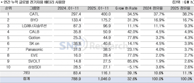 6일 시장조사업체 SNE리서치에 따르면 지난해 1~11월 세계 각국에 등록된 전기차(EV, PHEV, HEV)에 탑재된 총 배터리 사용량은 약 1천46GWh로 전년 동기 대비 32.6% 성장했다. 이 기간 LG에너지솔루션, SK온, 삼성SDI 등 국내 배터리 3사의 글로벌 전기차용 배터리 사용량 시장 점유율은 전년 동기 대비 3.5%p 하락한 15.7%를 기록했다. LG에너지솔루션은 전년 동기 대비 11.1%(96.9GWh) 성장하며 3위를 유지했다. SK온은 14.1%(40.6GWh)의 성장률을 기록해 6위에 올랐다. 삼성SDI는 5.1%(27.1GWh) 감소한 것으로 나타났다. 주로 테슬라에 배터리를 공급하는 일본 파나소닉은 올해 배터리 사용량 38.5GWh를 기록하며 7위에 올랐다. 중국 CATL은 전년 동기 대비 34.5%(400GWh) 성장하며 글로벌 1위 자리를 유지했다. BYD는 31.3%(175.2GWh) 성장률과 함께 글로벌 배터리 사용량 2위를 기록했다. SNE리서치 관계자는 "새해 이후 배터리사 경쟁력은 글로벌 확장 자체보다 지역별 규제 변화에 맞춰 전기차와 ESS를 포괄하는 제품, 고객, 생산거점 포트폴리오의 재설계에 달려있을 것"이라고 분석했다.