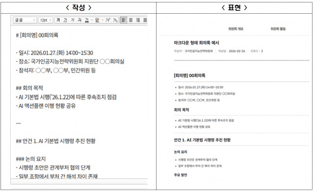 정부가 문서 작성 체계를 인공지능(AI) 중심 구조로 전환해 정책 데이터 활용 기반을 넓혔다. 국가AI전략위원회는 분과별 회의와 토론 결과 문서를 AI 친화 텍스트 형식인 마크다운으로 작성·관리한다고 5일 밝혔다. 해당 문서를 위원회 누리집을 통해 공개해 정책 데이터 활용 범위를 강화할 방침이다. 이번 조치는 기존 공공기관 문서 체계가 AI 활용에 적합하지 않다는 문제 인식에서 출발했다. 그동안 공공기관은 한글 문서 중심으로 정책 기록을 작성해 왔다. 기존 한글 문서는 글꼴, 자간, 기호표 등 다양한 편집 요소가 포함돼 문장 구조와 의미를 AI가 정확히 파악하기 어렵다는 지적이 있었다. 사람이 읽기에는 편하지만 AI 학습 데이터로 활용하기에는 한계가 있었다는 설명이다. 위원회는 회의와 토론 결과 문서가 공적 의사결정이 축적된 고품질 정책 데이터라고 봤다. 이런 데이터는 AI의 한국어 이해 능력을 높이는 데 중요한 자산이 될 수 있다는 판단이다. 이에 따라 문서 작성 체계를 AI 활용에 맞는 구조로 전환해 정책 데이터의 활용 가치를 높이겠다는 계획이다. 마크다운은 제목과 문단, 목록 등 문서 구조를 단순 기호로 표현하는 방식이다. 복잡한 서식 없이 사람이 읽기 쉽고 AI도 구조를 인식하기 쉬운 문서 형식으로 국제적으로 널리 사용된다. 위원회는 이번 전환으로 축적되는 정책 데이터를 기업들이 AI 모델 개발과 서비스 혁신에 활용할 수 있을 것으로 기대했다. 민간 중심 AI 생태계 활성화에도 도움이 될 수 있다는 전망이다. 임문영 국가AI전략위원회 상근 부위원장은 "AI 시대에는 정책 내용뿐 아니라 정책이 축적 관리되는 방식을 혁신하는 것 자체가 중요하다"며 "이번 문서 체계 전환은 정부가 AI를 활용하는 방식과 일하는 문화를 바꾸는 출발점이 될 것"이라고 밝혔다.