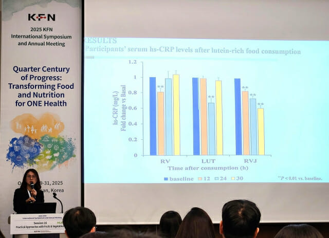 직접 착즙한 채소주스 섭취 시 혈당 조절 및 혈중 염증 지표 개선에 효과적인 것으로 나타났다. 휴롬은 지난 30일 부산 벡스코에서 열린 '2025 한국식품영양과학회 국제심포지엄'에서 채소 과일 섭취 관련 연구 결과를 발표했다고 3일 밝혔다. 윤정미 전남대학교 식품영양과학부 교수는 "루테인이 풍부한 채소주스 섭취는 혈중 염증 지표 개선에 효과적"이라고 밝혔다. 윤 교수 연구팀은 건강한 성인 18명을 대상으로 루테인이 풍부한 케일·시금치·사과 착즙주스를 섭취시킨 후 염증지표인 고감도 C-반응단백을 측정했다. 그 결과 섭취 12시간 후 17%, 24시간 후 26%, 30시간 후 39% 감소하는 것을 확인했다. 연구팀은 루테인이 풍부한 착즙주스는 섭취 후 30시간까지 염증지표를 지속적으로 낮춰 체내 염증 개선에 도움이 된다고 밝혔다. 휴롬과 산학 연구로 진행한 윤정미 교수의 이번 연구는 지난 7월 SCI급 저널인 '영양 연구 및 실습'에 게재된 바 있다. 곽정현 인제대학교 식품영양·식품공학부 교수는 "녹색 잎채소와 과일을 많이 섭취할수록 제2형 당뇨병 위험이 낮아진다"고 밝혔다. 곽정현 교수 연구팀에 따르면, 건강한 성인 10명을 대상으로 샐러리·양배추·케일·레몬 착즙주스를 빵과 함께 섭취했을 때 물과 함께 빵을 섭취한 경우보다 식후 혈당 증가 폭이 14.2% 더 적게 나타났다. 이는 레몬의 탄수화물 분해효소 활성 억제와 셀러리·케일의 낮은 당 함량 및 폴리페놀에 의한 체내 당 흡수 지연 효과에 기인한 것으로 분석됐다. 곽정현 교수는 혈당 스파이크 예방을 위해 ▲식사 시 채소 먼저 먹기▲브로콜리, 시금치, 상추 등 비전분 채소 섭취 ▲사과, 배, 오렌지 등 저혈당지수 과일 선택 ▲첨가당이 들어간 주스는 피하고 채소 비중이 높은 신선한 착즙주스 섭취하기 등을 제안했다. 김병재 의학박사는 "채소·과일 섭취가 당뇨병과 심혈관 질환 위험을 낮추며 특히, 신선한 채소과일 착즙주스는 염증과 산화 스트레스를 감소시켜 당뇨병 관리에 긍정적인 영향을 주는 것으로 확인된다"고 밝혔다. 황지윤 상명대 식품영양학과 교수는 "국민들의 채소 과일 섭취량이 지속적으로 감소 추세"라며 채소와 과일의 섭취를 높이고 붉은 고기, 가공육, 첨가당의 섭취를 줄이는 '지구건강식사'를 제안했다. 지구건강식사는 지속가능한 식생활 개념이다. 과일과 채소, 콩류, 전곡류, 견과류의 섭취를 늘리고, 붉은 고기, 가공육, 첨가당의 섭취를 줄이는 것을 기본 개념으로 한다.