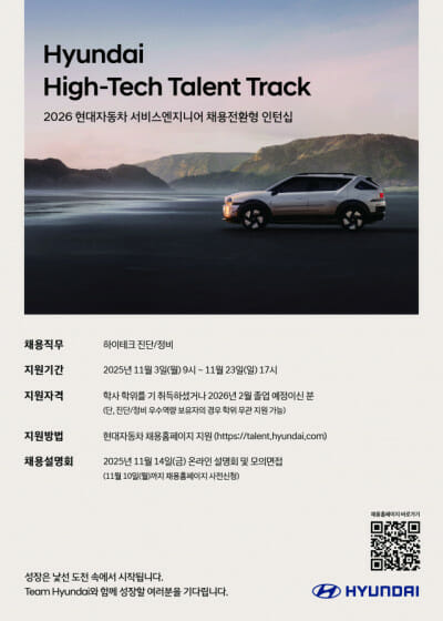 현대자동차가 서비스엔지니어 인재 발굴을 위한 채용전환형 인턴십 프로그램 '하이테크 탤런트 트랙' 지원자를 모집한다고 3일 밝혔다. '하이테크 탤런트 트랙'은 전기·전자, IT/SW 등에 대한 복합적인 기술 이해를 바탕으로 고난도 진단 및 정비 역량을 갖춘 전문가를 육성하기 위한 현대차의 채용 및 교육 프로그램이다. 최종 합격자는 전국 22개 하이테크 센터에서 진행되는 현장 실무 교육과 차량 통신(V2X), 소음 및 진동(NVH) 등 첨단 분야별 특화 교육을 받으며 모빌리티 서비스 경쟁력을 선도하는 핵심 인재로 성장하게 된다. 향후 우수 인재로 선발될 경우 글로벌 시장에서 기술 전문가로 성장할 수 있는 폭넓은 경력 개발 기회도 얻을 수 있다. 인턴십 참여를 희망하는 지원자는 3일 오전 9시부터 11월 23일 오후 5시까지 현대차 채용 홈페이지를 통해 접수하면 된다. 신청 자격은 학사 학위 취득(예정)자이나, 진단 및 정비 관련 우수한 역량을 보유한 경우 학위와 무관하게도 지원 가능하다. 채용 절차는 ▲서류전형 ▲인성검사 ▲면접전형 순으로 진행되며, 1차 면접 합격자는 내년 1월 말부터 2월 중순까지 약 3주간 인턴십에 참여하게 된다. 이후 현대차는 최종 면접을 거쳐 2026년 3월 서비스엔지니어 신입사원을 정규 채용한다. 한편, 현대차는 오는 14일 '하이테크 탤런트 트랙'에 관심 있는 구직자를 대상으로 온라인 채용설명회 및 모의면접을 개최한다. 참가자들은 현직자와 실시간으로 소통하며 직무 특성과 채용 절차에 대한 심층적이고 정확한 정보를 얻을 수 있다. 또한, 모의면접에서 우수한 평가를 받은 지원자에게는 서류전형 가산점도 부여된다. 온라인 채용설명회 및 모의면접 참가 신청은 11월 10일까지 현대차 채용 홈페이지에서 가능하다. 현대차 관계자는 "자율주행, 로봇 등 미래 모빌리티 기술 발전과 변화에 따라 자동차 정비 분야 엔지니어의 역할과 전문성도 진화하고 있다"며 "현대차는 첨단 분야까지 확장될 미래에 대비해 잠재력 있는 인재를 선발하고, 독보적인 역량을 가진 하이테크 전문가로 육성해 서비스 경쟁력을 강화할 계획이다"고 밝혔다.