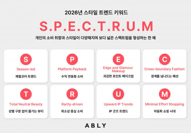 에이블리코퍼레이션(대표 강석훈)이 운영하는 스타일 커머스 플랫폼 에이블리는 2026년 스타일 트렌드로 'S.P.E.C.T.R.U.M(스펙트럼)'을 선정했다고 14일 밝혔다. 개인의 소비 취향과 스타일이 다양해지며, 보다 넓은 스펙트럼을 형성하는 한 해를 예고하는 동시에, 에이블리가 그 중심에서 혁신을 주도하겠다는 목표를 담았다. '스펙트럼'은 에이블리가 보유한 월 1천만 명 이상 사용자로부터 쌓은 검색, 거래액 등 빅데이터를 종합 분석해 도출한 키워드다. 2025년 한 해 동안 에이블리 검색량은 6억 3천만 회를 넘었으며, 검색 키워드 수는 3천300만 개 이상으로 소비 트렌드를 이끄는 활발한 앱 사용을 증명했다. S.P.E.C.T.R.U.M은 ▲Season-led(제철코어 트렌드) ▲Platform Payback(수익 연동형 소비) ▲Edge and Glamour Makeup(과감한 포인트 메이크업) ▲Cross-boundary Fashion(경계를 넘나드는 패션) ▲Total Neutral Beauty(성별 구분 없이 즐기는 뷰티) ▲Rarity-driven(희소성 중심 소비) ▲Upward IP Trends(IP 굿즈 트렌드) ▲Minimal Effort Shopping(자동화 쇼핑 시대)을 의미한다. 제철 음식을 있는 그대로 소비하는 것을 넘어 패션 스타일링, 화장법, 폰케이스 등 라이프스타일 전반에 녹여내는 '제철코어' 트렌드(Season-led)가 지속될 전망이다. 지난해 8월 '토마토 지갑'(515%), '토마토 폰케이스'(43%) 키워드가, 12월에는 '붕어빵 손난로'(463%) 검색이 전년 동기 대비 급증했다. 최근 일주일(1월 5~11일) '딸기 파우치'(1,572%), '딸기 필통'(236%) 등 겨울 대표 제철 과일인 딸기 관련 검색도 전년 대비 증가하며 제철코어 트렌드가 지속되고 있음을 입증했다. 콘텐츠 공유 및 소비가 수익으로 연결되는 수익 연동형 소비 행태가 확대될 것으로 보인다. 크리에이터가 상품 정보를 공유하고 이를 통한 유입, 구매 등 성과에 따라 수익을 얻을 수 있는 '어필리에이트' 모델이 주목받고 있다. 에이블리 어필리에이트는 별도의 자격 요건 없이 누구나 참여할 수 있도록 진입 장벽을 낮춘 점이 특징이며, 누적 크리에이터 수는 100만 명을 돌파했다. 과감한 포인트 메이크업에 대한 수요가 증가할 것으로 예측된다. 가닥 속눈썹, 노글루 속눈썹 등 인조 속눈썹의 디자인 및 형태가 다양화되고, 얼굴에 입체감을 더해주는 하이라이터의 컬러가 세분화되는 등 메이크업에 화려함을 더해주는 아이템이 높은 인기를 얻고 있다. 최근 2000년대 유행했던 '갸루 메이크업'이 다시 주목받으며 트렌드 확산에 힘을 보태고 있는 점도 눈에 띈다. 계절, 기장 등 고정관념을 깨고 경계를 넘는 패션 스타일이 지속될 것으로 보인다. 짧거나 긴 기장으로 양분화됐던 과거와 달리 '하프 코트', '7부 바지' 등 아우터부터 하의까지 중간 길이 의류가 두각을 나타내고 있다. 계절 경계가 흐려짐에 따라 여름에도 '살안타템(햇빛으로부터 피부를 보호하기 위한 의류)'으로 긴소매 셔츠, 얇은 가디건을 착용하고 한겨울에도 반소매 니트, 코듀로이 소재 반바지 등 짧은 기장 의류를 워머, 레깅스 등과 조합해 입는 모습이 관찰되고 있다. 성별 구분 없이 자신을 가꾸는 것을 즐기는 이들이 늘고 있다. 에이블리가 운영하는 남성 쇼핑 플랫폼 '4910(사구일공)'은 지난해 8월 베타 운영을 시작으로, 12월 뷰티 카테고리를 공식 론칭했다. 지난 11월 4910 뷰티 거래액은 시범 운영을 시작한 8월 대비 네 달 만에 3배가량(193%) 성장하는 성과를 기록해 남성 뷰티에 대한 높은 관심을 증명했다. 뷰티, 푸드 등 다양한 카테고리를 아울러 '희소성'이 곧 소비의 기준으로 떠오르고 있다. 지난해 뷰티 카테고리에서는 '에뛰드', '네이밍', '아이쁘' 등의 브랜드가 에이블리를 통해 신상품을 단독 선발매했으며, 초도 물량 완판은 물론 브랜드 거래액 성장을 견인하는 등 흥행을 이끌었다. 지난달 푸드 카테고리에서는 전국 각지 품절 대란을 일으킨 '두바이 쫀득 쿠키' 검색량이 SNS에서 화제 되기 시작한 10월 대비 5.7배 이상(471%) 증가했다. IP(지식재산권) 기반 굿즈 트렌드가 지속될 것으로 보인다. 캐릭터, 웹툰, K팝 등 다양한 영역에 걸쳐 IP의 영향력이 확대되며 의류, 화장품, 문구 등 관련 굿즈 상품의 인기도 상승 추세다. 에이블리 내에서도 MZ세대 인기 캐릭터를 활용한 화장품, K팝 아티스트 굿즈 등 다양한 굿즈가 꾸준히 인기를 끌고 있다. 지난해 에이블리가 글로벌 e스포츠 기업 'T1'의 공식 스폰서로 나서며 판매를 시작한 유니폼, 응원봉, 텀블러, 키링 등 T1 선수단과 팀의 정체성을 담은 공식 굿즈도 e스포츠 팬들로부터 많은 관심을 얻고 있다. 검색, 클릭의 번거로움 없는 쇼핑 방식이 일상화될 전망이다. 에이블리는 업계 최초 자체 개발 'AI 개인화 추천 기술'에 빅데이터를 접목해 정교한 취향 추천 서비스를 제공하고 있다. 영상과 음성을 중심으로 상품 정보를 파악할 수 있는 '라이브 방송'도 인기다. '블랙업', '베니토', '컴포트랩', '예일', '스파오' 등 패션 쇼핑몰 및 브랜드는 물론 '롬앤', '투쿨포스쿨', '릴리바이레드', '마미케어' 등 뷰티 브랜드와 '봄날엔', '플라이밀' 푸드 브랜드까지 다양한 입점사가 에이블리와 손잡고 방송을 진행해 높은 유저 호응을 이끌고 있다. 에이블리 관계자는 “분야별 소비 패턴 변화 속도가 매년 빨라