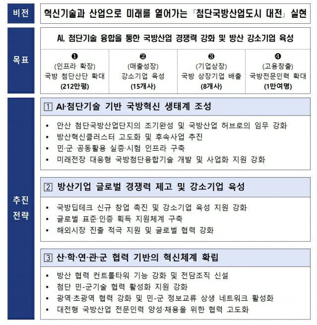 대전시가 인공지능(AI)과 첨단기술 기반 미래 국방산업 육성에 오는 2030년까지 8,736억 원을 투입하기로 했다. 대전시와 대전과학산업진흥원(Distep)이 12일 공개한 '대전광역시 제2차 중장기 국방산업 로드맵(2026~2030년)'에 따르면 방위사업청 이전과 안산 첨단국방산업단지 조성 등 핵심 인프라 확충을 계기로 연구개발(R&D)과 사업화를 연계한 국방산업 혁신 생태계를 구축할 계획이다. 사업 예산은 올해부터 2030년까지 5년간 총 8,736억 원(국비 7,805억 원, 시비 889억 원, 민간 42억 원)을 투입한다. 주요 목표는 ▲국방 첨단산업단지 212만 평 확대 ▲연매출 300억 원 이상 방산 강소기업 15개 육성 ▲국방 분야 상장기업 8개 배출 ▲국방 전문 연구·산업 인력 1만 명 확보 등이다. 이를 위해 ▲인공지능(AI)․첨단기술 기반 국방혁신 생태계 조성 ▲방산기업 글로벌 경쟁력 강화 및 강소기업 육성 ▲산․학․연․관․군 협력 기반 혁신체계 확립 등 3대 전략과 11개 중점 과제를 추진하기로 했다. 대전시는 먼저 안산 첨단국방산업단지 조기 완성과 방산혁신클러스터 고도화, 민․군 공동 활용 실증․시험 인프라 구축, 미래전장 대응형 국방첨단융합기술 개발 및 사업화 지원에 나설 계획이다. 또한 국방 딥테크 분야 창업을 촉진하고 기업 성장 단계별 맞춤 지원, 글로벌 표준·인증 획득 지원, 해외 전시회와 수출 컨설팅 등 해외시장 진출 지원을 확대하기로 했다. 방산 협력 컨트롤타워 기능을 강화하고 전담조직도 신설해 산학연군 협력 거버넌스를 구축한다. 민․군 기술협력 확대와 정보교류 네트워크 활성화, 국방산업 전문인력 양성 및 채용 협력도 추진한다. 유세종 대전시 미래전략산업실장은 “대전은 정부출연연구기관과 과학기술 인프라가 집적된 연구개발 중심 도시로 첨단 국방기술을 선도할 충분한 역량을 갖추고 있다”라며 “AI와 첨단기술이 융합된 국방혁신 생태계를 구축해 지역 방산기업이 글로벌 경쟁력을 갖춘 강소기업으로 성장할 수 있도록 적극 지원하겠다”라고 말했다.