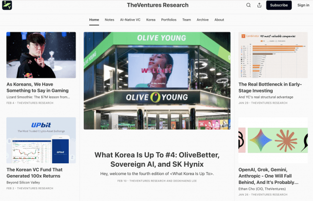 더벤처스(대표 김철우)가 국내 스타트업의 글로벌 투자 유치를 지원하기 위해 전용 영문 미디어 채널 '더벤처스 리서치'를 공식 출시했다고 19일 밝혔다. 최근 오픈AI, 구글 등 글로벌 빅테크 기업이 한국 스타트업에 활발하게 투자하면서 한국 시장에 대한 해외 투자자들의 관심이 커지고 있다. 더벤처스는 이런 흐름에 맞춰 안드레센 호로위츠(a16z), 세쿼이아 캐피탈 등 실리콘밸리 주요 투자사가 활용하는 미디어 기반 전략을 도입했다. 이는 투자사가 직접 산업 미디어를 운영하며 포트폴리오사의 해외 노출을 늘리고 글로벌 파트너십을 지원하는 방식이다. 대표적으로 더벤처스는 AI 심사역 '비키'의 6개월 실전 투입 검증 결과를 공개했다. 비키는 인간 심사역과의 판단 일치율 87.5%를 기록하며 기술 유효성을 입증했고, 기존 한 달 이상 소요되던 투자 심사 기간을 1주로 단축했다. 더벤처스는 심사 과정의 병목을 해결해 창업자에게 빠른 의사결정을 제공하는 동시에, 한국 투자 산업의 AI 역량을 글로벌 시장에 입증한 사례로 이를 평가하고 있다. 이 외에도 중국 커머스 기업의 한국 시장 진출에 따른 리테일 시장 재편 현황, 한국 스타트업 생태계의 성장 동력 분석 등 투자 현장에서 확보한 1차 데이터를 기반으로 정기 리포트를 발행하고 있다. 출시 이후 뉴스레터 구독자 중 40%가 해외 독자로 집계됐으며, 이 중 대다수가 투자 및 금융 업계 종사자로 나타났다. 특히, 월가 주요 금융기관의 리서치 총괄과 실리콘밸리의 연쇄 창업가, 해외 탑티어 기관 투자자 등이 주요 독자층에 포함된 것으로 확인됐다. 이런 고관여 독자층을 바탕으로 실제 해외 투자사 및 기관 투자자들로부터 구체적인 협업 문의가 이어지고 있다. 더벤처스 리서치 콘텐츠는 더벤처스 파트너와 심사역들이 필진으로 직접 참여해 투자 현장 데이터를 기반으로 작성한다. 더벤처스는 향후 분기별 한국 투자 산업 리포트와 주요 포트폴리오사의 글로벌 진출 성과를 공개해 해외 투자자들이 국내 산업 동향을 파악하는데 필수적인 레퍼런스로 자리 잡겠다는 계획이다. 김철우 더벤처스 대표는 "벤처캐피탈의 경쟁력은 미디어 영향력과 네트워크 파워에서 결정된다"며 "앞선 AI 기술과 실리콘밸리형 미디어 전략을 결합해 국내 유망 스타트업들이 해외 시장에서 합당한 평가를 받을 수 있도록 지원하겠다"고 밝혔다.