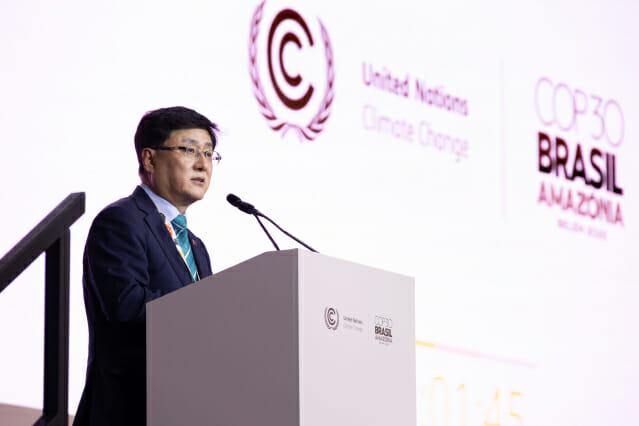 정부가 17일(현지시간) 브라질 벨렝에서 개최 중인 '제30차 유엔기후변화협약 당사국총회(COP30)'에서 온실가스를 2018년 대비 53~61% 감축하는 내용의 '2035 국가온실가스 감축목표(NDC)'를 발표했다. 김성환 기후에너지환경부 장관은 이날 COP30 고위급 회회에서 2035 NDC를 발표했다. 우리나라가 2018년 대비 53~61% 감축목표를 토대로 2050년 탄소중립을 이행하고 탈탄소 녹색 전환을 이루어내겠다는 의지를 국제사회에 표명했다. 김 장관은 이어 점점 복잡해지는 전 지구적 차원의 불확실성에도 불구하고, '글로벌 무치랑(공동협력)' 정신을 바탕으로 다자주의에 기반해 기후위기에 대응할 것을 국제사회에 촉구했다. 김 장관은 이에 앞서 석탄발전의 단계적 폐지 달성을 목표로 하는 국제협력 이니셔티브인 탈석탄동맹(PPCA) 동참을 선언했다. 탈석탄동맹은 석탄발전의 단계적 폐지를 목표로 정책교류·기술적 지원 등 실질적 협력 플랫폼을 제공하며, 현재까지 180여 개 회원(정부·지방정부·기업 등)이 이에 참여하고 있다. 우리나라는 충청남도·경기도 등 8개 지방정부가 이미 가입한 바 있다. 김 장관은 또 '기후·청정에너지 전환 포럼'에 참석해 주요국 장관과 재생에너지 중심 탈탄소 전환에 대한 정책 비전을 공유했다. 이 행사는 지난 COP28에서 합의된 '전지구적 재생에너지 발전용량 3배, 에너지 효율 2배'의 이행을 가속하기 위한 논의의 자리로 기후부와 한국에너지공단이 공동으로 개최했다. 이날 행사에서는 호주의 크리스 보웬 기후변화·에너지·환경·수자원부 장관, 포르투갈의 장 바호카 에너지부 차관, 덴마크의 올레 톤케 기후대사가 주제발표 시간(세션)에 참여해, '재생에너지 중심 에너지 전환을 통한 전 지구적 탄소중립 달성'을 주제로 논의를 펼쳤다. 김성환 장관은 “기후위기 대응은 운명공동체인 지구촌이 함께 해야 하는 모든 인류의 과제”라며 “기후부는 앞으로도 국제사회와 협력하며 전 지구적 탈탄소 전환에 적극 참여해 대한민국이 탈탄소 녹색 문명을 만드는 모범국가가 될 수 있도록 노력하겠다”고 밝혔다.