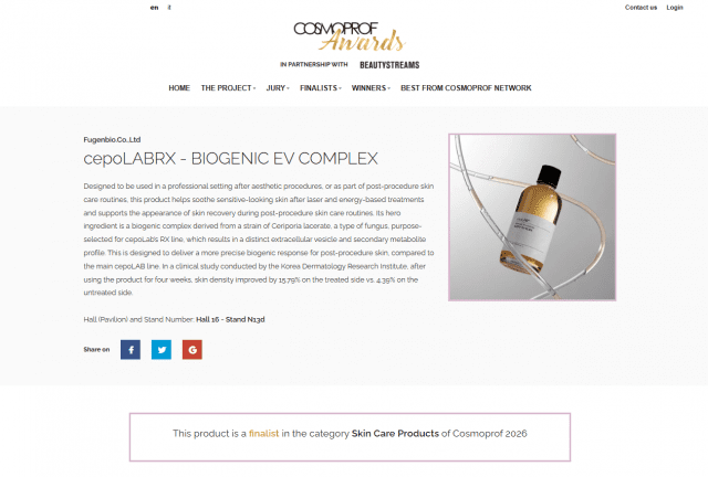 바이오 신물질 기반 항노화 헬스케어 기업 퓨젠바이오(대표 김윤수)가 전개하는 바이오 더마 스킨케어 브랜드 세포랩RX는 세계 최대 뷰티 박람회 코스모프로프가 주최하는 '2026 코스모프로프 어워즈'에서 '세포랩RX 바이오제닉 EV 컴플렉스'가 스킨케어 부문 파이널리스트에 선정됐다고 27일 밝혔다. 세포랩RX는 이달 26∼28일(현지 시각) 이탈리아 볼로냐 피에레 전시장에서 개최 중인 '코스모프로프 월드와이드 볼로냐(Cosmoprof Worldwide Bologna)'에 참가, 아시아 지역 뷰티 브랜드 중 유일하게 코스모프로프 어워즈 스킨케어 부문 최종 후보에 올랐다. 코스모프로프 어워즈는 '화장품계의 오스카상'으로 불리는 뷰티 업계 세계 최고 권위의 상이다. 이번 코스모프로프 어워즈 파이널리스트로 선정된 '세포랩RX 바이오제닉 EV 컴플렉스'는 피부과에서 레이저 시술 후 스킨케어 루틴의 일부로 사용하도록 설계된 클리닉 전용 제품이다. 레이저 시술 직후 민감해진 피부를 빠르게 진정·회복시키는 한편, 피부세포의 재생을 촉진해 시술과 상승작용을 하며 피부 개선 효과를 극대화하는 것이 특징이다. 특히, 시술의 주요 성과지표인 피부 치밀도 개선 및 처짐 개선(리프팅) 효과가 탁월하다. 핵심 성분은 세포랩 RX 라인을 위해 특별히 선별된 희귀 미생물 세리포리아 락세라타에서 추출한 바이오 신물질 '클렙스' 콤플렉스다. 이 콤플렉스는 독특한 세포외소포(EV, Extracellular Vesicles)와 2차대사산물(Secondary Metabolite) 프로필을 생성, 세포랩 일반 라인보다 시술 후 피부에 더욱 정밀한 바이오제닉 반응을 제공하도록 설계됐다. 한국피부과연구원에서 실시한 인체적용시험 결과, 4주간 사용 후 시술 부위의 피부 밀도가 15.79% 증가한 반면, 미시술 부위는 4.39% 증가한 것으로 나타났다. 퓨젠바이오 측은 고밀도 EV 대사산물 복합체에 EWG 1등급을 충족하는 4개 성분만을 추가해 시술 후 민감한 피부에도 안전하게 사용할 수 있도록 설계된 점과 인공 향료·색소·방부제를 일절 사용하지 않고 친환경 제조공정을 적용한 점이 특히 높은 평가를 받았다고 보고 있다. 퓨젠바이오는 세포랩과 세포랩RX를 필두로 지난해부터 글로벌 시장 진출에도 속도를 내고 있다. 특히 현재 시장조사 단계에 있는 유럽 지역에서의 반응이 높은데, 천연 성분의 친환경 화장품이라는 점이 성분을 중시하는 유럽 소비자에게 크게 어필하고 있는 것으로 분석된다. 김윤수 대표는 “지난해 11월 론칭한 세포랩의 세컨드 브랜드 세포랩RX로 화장품의 본고장 유럽에서 열리는 세계 최대 뷰티 박람회 '코스모프로프 월드와이드 볼로냐'가 주최하는 최고 권위의 뷰티 어워즈에서 파이널리스트로 선정되는 영예를 얻어 매우 기쁘다”며, “코스모프로프에서의 성과를 바탕으로 글로벌 진출에 박차를 가해 세포랩과 세포랩RX를 K-뷰티를 대표하는 글로벌 프리미엄 스킨케어 브랜드로 포지셔닝 하겠다”고 소감을 말했다.