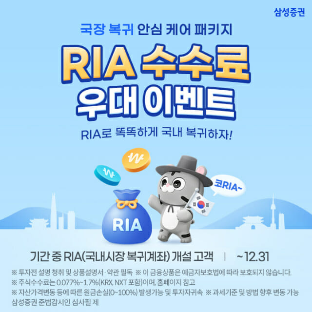 삼성증권이 지난해 12월 23일 기준 해외주식을 보유한 국내거주 개인고객 대상으로 'RIA 수수료 우대 이벤트' 를 올해 말까지 진행한다고 23일 밝혔다. RIA 계좌란 해외주식 매도자금을 원화 환전 후 국내주식에 장기 투자 시 한시적 해외주식 양도세 세제혜택을 부여하는 계좌이다. RIA 계좌 개설 후 해외주식을 입고, 매도하면 원화로 자동 환전되고 국내주식에 1년 이상 재투자 해야한다. 해외주식 매도자금 5000만원 한도 내에서 국내주식 매수 시 올 5월까지 100%, 7월까지 80%, 연말까지 50% 해외주식 양도세를 감면해준다. 삼성증권은 RIA 계좌 개설 시 계좌 내 두가지 수수료 혜택을 제공한다. 첫째, 국내주식 수수료 혜택이다. 국내주식 매수, 매도 수수료를 1년간 00027033~0.0042087% 우대해준다. 둘째, 환전 수수료 혜택이다. 외화를 원화로 환전 시 환전 수수료를 우대해준다. 삼성증권 관계자는 "한국 주식 시장의 밸류에이션 매력이 재평가되고 있는 상황에서, RIA 계좌를 통한 한국 주식 장기 투자 활성화를 기대한다"고 밝혔다.