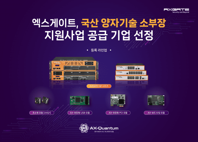 네트워크 보안 전문기업 엑스게이트(대표 주갑수)는 '국산 양자기술 소부장 보급 활용 지원 사업의에 공급기업에 선정됐다고 16일 밝혔다. 이 사업은 한국지능정보사회진흥원(NIA)과 한국정보통신진흥협회(KAIT)가 전담과 운영을 맡으며, 공급기업이 보유한 양자 기술을 맞춤형으로 수요 기업에 제공한다. 엑스게이트는 이번 지원사업에 부품군인 양자난수생성 칩 4종(AXQ1, AxEQU, AxIQP, AxEQP)과 함께, 차세대방화벽(NGFW)장비 전 라인업 및 통합보안솔루션(UTM) 장비군까지 총 17가지의 양자 기술 솔루션을 등록했다. 이는 엑스게이트의 양자 기술을 적용한 모든 솔루션을 등록한 것으로, 수요 기업의 다양한 요구를 모두 충족함은 물론 관련 설치와 적용에 빠르게 대응할 예정이라고 밝혔다. 올해 처음 시행한 이번 '양자기술 소부장 보급 활용 지원사업'은 외산에 의존하고 있는 양자 분야 소부장 국산화를 도모하고자, '양자 과학기술 및 양자산업 육성에 관한 법률'에 근거, 시행됐다. 자체 기술을 보유한 공급기업의 적정성을 평가하고, 양자 기술 도입을 희망하는 수요처를 모집 후, 수요 기업의 구매비용을 최대 1억까지 지원한다. 연구소·공공기관·대학교 등은 자부담금 없이 최대 한도까지 전액 지원이 가능하며, 중견·중소·벤처기업 등은 10% 이상의 자부담금 부담으로 엑스게이트 양자 기술을 접할 수 있다. 이번 공급기업에 등록된 엑스게이트의 모든 솔루션은 하드웨어 방식의 QRNG 기술과 소프트웨어 방식의 PQC 방식을 하이브리드 형태로 기본 제공한다. QRNG 모듈형에서부터 상용화된 PQC를 활용한 양자 VPN까지 공급이 가능한 국내 유일한 업체라고 회사는 강조했다. QRNG는 KCMVP 인증으로 신뢰성을 인정받았고, 뛰어난 연산 능력을 갖춘 양자컴퓨팅 환경에서도 해독 불가능한 네트워크 구축이 가능하다고 회사는 밝혔다. PQC 방식은 미국 NIST(국립표준기술연구) 표준 선정 PQC알고리즘(CRYSTALS-KYBER) 사용이 가능하다. 엑스게이트는 국가 차원의 첫 양자 분야 지원사업의 공급기업 등록에 이어, 내년에도 공급기업으로 참여, 다양한 분야의 양자 기술 시장 공략을 이어갈 계획이다. 엑스게이트 주갑수 대표는 “이번 사업의 공급기업에 선정된 것은 우리가 보유한 양자 기술의 신뢰성을 인정받은 것”이라며 “저렴한 비용으로 더 다양한 분야에 양자 기술을 공급할 수 있는 이번 사업의 성공을 위해, 관련 투자와 컨설팅 및 기술지원 등의 지속적인 노력을 이어갈 것”이라고 밝혔다.