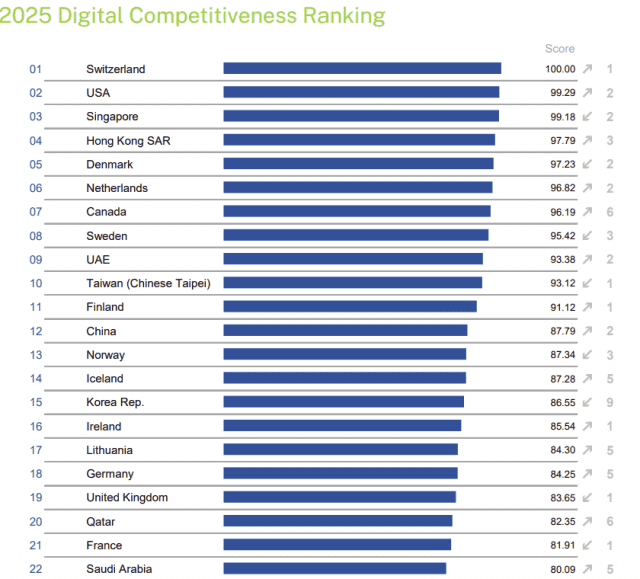 올해 한국의 디지털 경쟁력이 급락하며 주요 경쟁국에 크게 뒤처진 것으로 나타났다. 기술·규제 환경과 미래 준비 부문도 동반 하락했으며 특히 고급 디지털 인재 확보력과 민첩성 저하가 구조적 약점으로 지목됐다. 17일 스위스 국제경영개발원(IMD)이 발표한 '세계 디지털 경쟁력 순위(WDCR) 2025' 보고서에 따르면 한국은 전체 69개국 중 15위를 기록해 전년 대비 9계단이나 떨어졌다. 2021년 이후 꾸준히 10위권 내에 머물렀던 상승세가 4년 만에 꺾인 것으로, 싱가포르·홍콩·대만·중국 등 아시아 주요 경쟁국에도 모두 뒤처졌다. 인구 2천만 명 이상 국가 그룹에서도 한국은 지난해 2위에서 올해 5위로 하락했다. 보고서에 따르면 한국은 핵심 평가 분야 3개 중 '기술' 부문이 14위에서 30위로, '미래준비도' 부문이 3위에서 15위로 급락하며 전체 순위가 하락했다. 특히 기술 부문에서는 규제환경(18→38위), 자본(17→27위), 기술 인프라(9→15위) 등 모든 영역에서 후퇴가 나타났다. 규제 관련 세부 지표 중 이민법(63위), 기술개발·적용(55위), 지식재산권(52위), 기술개발 투자(49위), 벤처캐피털(46위) 등이 약점으로 분류되며 글로벌 혁신환경 경쟁에서 불리한 구조가 드러났다. 미래준비도 부문에서는 민첩성과 적응력, 기업의 디지털 활용 능력을 나타내는 지표들이 크게 떨어졌다. 특히 인터넷 소매 활동(59위), 유연성·적응력(48위) 등 디지털 전환 수용성과 직접 연관된 평가에서 순위가 하락했다. 기업의 빅데이터 활용, IT 통합 역량, 사이버보안 역량 평가 역시 국제 경쟁국 대비 부족한 것으로 나타났다. 반면 '지식' 분야는 8위로 비교적 선방했다. 그러나 이를 구성하는 세부 항목에서는 '인재' 부문이 19위에서 49위로 30계단 폭락해 심각한 인력 수급 문제를 드러냈다. 디지털·기술적 스킬(59위), 국제경험(58위), 외국인 고숙련 인력 유입(61위) 등 글로벌 인재 확보와 역량 수준을 나타내는 지표 상당수가 최하위권에 머물렀다. 그나마 교육·훈련(7위)과 과학 연구 집중도(1위)가 전체 지식 부문 순위를 지탱했다. 뿐만 아니라 보고서에서는 이민·계약 환경, 디지털 스킬, 기술 상용화 지표들이 연쇄적으로 낮은 점수를 기록해 디지털 생태계 전반에 제약이 있는 것으로 요약됐다. IMD는 "디지털 경쟁력은 기술 개발뿐 아니라 국가의 민첩성과 인재 역량, 규제 체계의 유연성이 종합적으로 결합될 때 비로소 강화될 수 있다"고 지적했다.