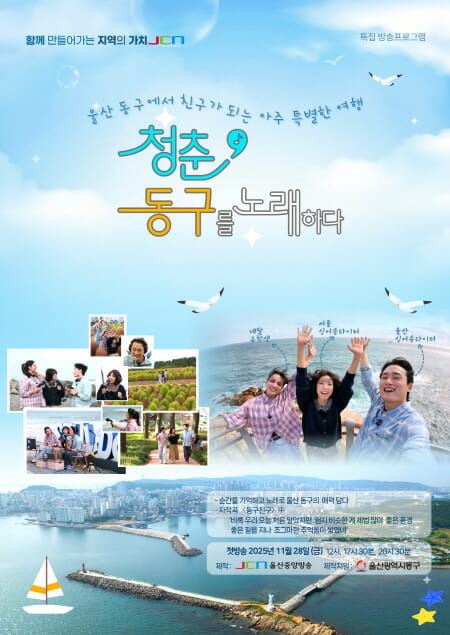 JCN울산중앙방송은 오는 28일 울산 동구의 바람 풍경 바다를 따라 걷는 청춘 여행기를 담은 특집 프로그램 '청춘, 동구를 노래하다'를 선보인다. 이 프로그램은 서로 다른 삶을 살아온 세 명의 청춘이 울산 동구 곳곳을 걸으며 자연스럽게 친구가 되어가는 과정을 음악과 함께 그려냈다. 출연진은 ▲싱어송라이터 정예원(서울) ▲싱어송라이터 길기판(울산) ▲유학생 차파가인 아누샤(네팔) 등 청춘 3인이다. 세 사람은 대왕암공원, 슬도, 일산해수욕장 등 동구의 대표 명소를 함께 걸으며 바다의 소리, 바람의 냄새, 풍경이 주는 감정을 차곡히 쌓아간다. 그 여정에서 쌓인 감정과 기억은 자연스레 '음악'이라는 결과물로 이어졌고, '동구 친구'라는 노래가 탄생한다. “비록 우리 오늘 처음 알았지만 왠지 비슷한 게 제법 많아 좋은 풍경 좋은 길을 지나 조그마한 추억들이 쌓였네” 짧은 여행 속에서 서로에게 스며든 마음을 담은 한 구절이다. 곽병오 JCN울산중앙방송 PD는 “각기 다른 환경에서 살아온 청춘들이 울산 동구에서 보낸 시간들이 쌓여 한 곡의 노래가 됐다”며 “누군가와 같은 길을 걷는 것만으로도 친구가 될 수 있다는 메시지를 전하고 싶었다”고 말했다.