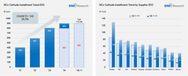 12일 SNE리서치에 따르면 지난해 1월부터 11월까지 전세계 전기차(EV, PHEV, HEV)에 투입된 양극재 총 적재량은 231만6천톤으로 집계됐다. 전년 동기 대비 36.7% 늘어난 수치다. 중국 외 시장으로는 79만9천톤을 기록, 전년 동기 대비 증가율은 29.3%로 분석됐다. 종류별로 보면, 삼원계 양극재 적재량은 90만3천톤으로 전년 동기 대비 12.5% 증가해 완만한 성장세를 이어갔다. 업체별 순위는 중국의 론바이가 1위를 지키며 선두를 유지했다. 엘앤에프(7만9천톤), 에코프로(5만6천톤), 포스코(4만3천톤) 등도 상위권에 포진해 한국계 공급사의 입지를 지켰다. 다만 전반적으로는 중국계 기업들의 약진이 더욱 두드러진다. 리샤인, 샨샨, 이스프링 등 주요 업체가 내수 기반 수요와 원가 경쟁력, 대규모 증설을 무기로 글로벌 점유율을 꾸준히 넓히는 모습이다. 같은 기간 리튬인산철(LFP)은 141만3천톤으로 전년 동기 대비 58.4% 급증했다. 전체 양극재 적재량에서 LFP가 차지하는 비중도 약 60%(무게 기준)로 높아졌다. 중국 내 보급형 전기차 확대, 높은 가격경쟁력에 따른 LFP 선호 심화, 글로벌 완성차의 채택 확대가 겹쳐 있다. 공급사별로는 후안유넝(32만1천톤)과 완런(22만1천톤)이 각각 1위와 2위를 차지했다. 다이나노닉(18만3천톤)과 로팔(16만3천톤)도 전년 대비 증가하며 3, 4위에 올랐다. SNE리서치는 "최근 중국이 배터리와 양극·음극 소재, 관련 장비와 기술 전반에 대해 수출 통제(라이선스) 체계를 강화하면서, 소재 조달의 판단 기준도 달라지고 있다"며 "LFP를 포함한 양극재는 단순한 가격 경쟁력보다 통관 리드타임, 계약의 안정성, 그리고 대체 조달이 가능한지 여부가 더 중요해지고 있다"고 분석했다. 이어 "이런 변화는 북미와 유럽을 중심으로 비중국 공급망, 특히 현지 양극재(CAM) 생산 구축을 서두르게 만드는 배경으로 작용하고 있다"며 "새해에는 전기차 판매 증가 자체보다, 원가 상승을 얼마나 흡수하고 마진을 관리할 수 있는지가 양극재 업체 실적을 가르는 핵심 요소가 될 가능성이 크다"고 진단했다.