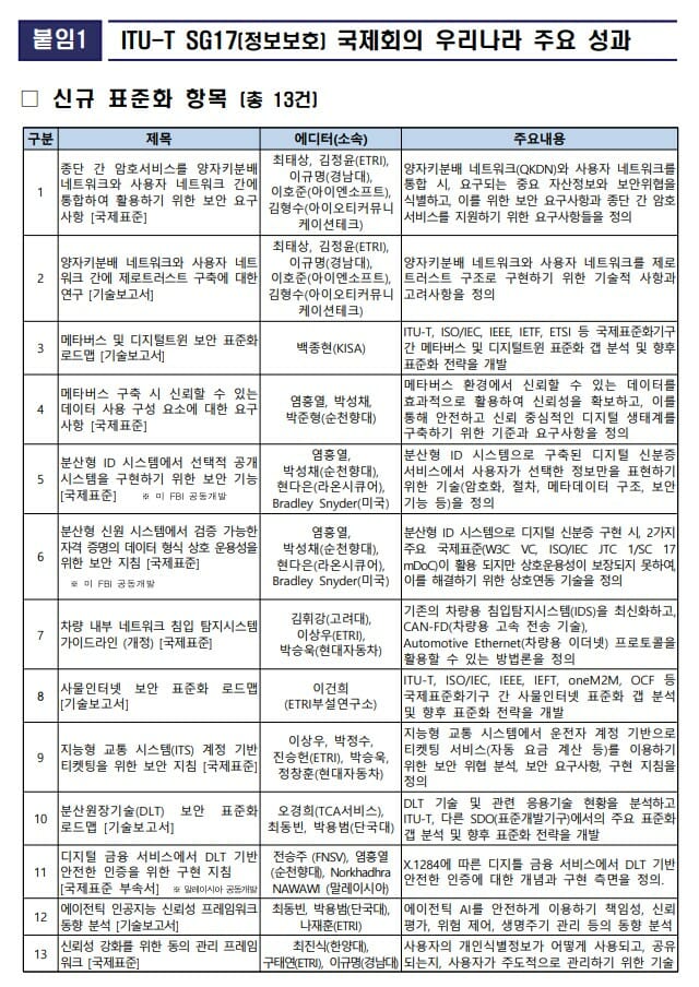 우리나라가 차세대 정보보호 국제표준을 주도하는데 큰 발판을 마련했다. 지난 3일부터 11일까지 스위스 제네바에서 열린 국제전기통신연합 전기통신표준화 부문(ITU-T) 정보보호연구반(SG17, 수석대표 순천향대 염흥열 교수) 국제회의에서 우리나라가 제안한 신규 표준화 항목 13건이 승인됐다. 승인은 보통 5단계로 이뤄진 국제 표준 최종 승인의 첫 번째 단계다. 이외에 국제표준 13건이 사전채택 됐다. 또 국제표준 1건과 기술보고서 1건 및 오류정정서 1건 등 3건이 최종 승인되는 개가를 올렸다. 보통 국제 표준화 과정은 신규 표준화 항목 승인→표준개발→사전채택→국제회람→최종 승인의 5단계를 거친다. 14일 과학기술정보통신부(부총리 겸 과기정통부 장관 배경훈, 이하 '과기정통부')에 따르면, 이번 국제회의에는 전 세계 66개 회원국 482명(온·오프라인 병행)의 전문가들이 참석했다. 우리나라는 다양한 산학연 관계자들로 구성한 76명의 국제 보안 표준 전문가들이 참석, 우리나라가 제안한 총 80건의 국내 정보보호 기술을 국제표준에 반영하기 위해 열띤 토론을 펼쳤다. 이번 국제회의에서는 총 221건(중국 84건, 한국 80건, 유럽 20건, 일본 9건, 기타 28건)의 기고서가 논의됐는데, 우리나라의 기고서 점유율(36%)은 중국(38%)에 이어 두 번째였다. 구체적으로, 우리나라는 이번 회의에서 ▲종단 간 암호기술을 양자키 분배 네트워크에 적용하기 위한 보안 표준 ▲디지털 신분증에서 특정 정보만을 선택해 제공할 수 있는 보안 기능 ▲차량 보안 강화를 위한 차량용 침입탐지시스템 ▲메타버스 환경에서 데이터의 신뢰성 확보를 위한 기준 및 요구사항 ▲차세대 보안(메타버스, 디지털트윈, 사물인터넷, 분산원장기술) 로드맵 개발 등 13건의 신규 표준화 항목을 승인받았다. 또 우리나라가 다년간 주도적으로 개발해 온 분산원장기술 기반 응용(신원관리, 전력거래시스템, 자산관리) 보안기술들과 소프트웨어 공급망 보안 위협 등 13건이 국제표준으로 사전채택됐다. 아울러 ▲모바일 단말의 보안성을 평가하는 보안기능 국제표준 ▲메타버스 응용에서 아바타의 데이터 보호를 위한 환경 분석 기술보고서 ▲분산원장기술 기반 데이터 접근 및 공유를 위한 보안 위협과 요구사항 오류정정서도 최종 승인됐다. 한편, 정보보호연구반이 인공지능 자체 보안, 생성형 AI 모델, 딥페이크 탐지 및 파인튜닝 보안 등 전반적인 인공지능 보안 기술을 전담할 연구과제(Question 16)의 잠정 신설에 합의함에 따라, 우리나라는 에이전틱 및 피지컬 AI 보안 등 신흥 분야까지 연구 범위를 확대, 새로운 리더십 확보를 목표로 적극 참여할 예정이다. 이 연구과제는 2026년 1월 표준화자문그룹(TSAG) 국제회의에서 심의할 예정이고, 2026년 6월경 차기 SG17 국제회의에서 최종 승인될 예정이다. 임정규 과기정통부 정보보호네트워크정책관은 “차세대보안 분야에서 표준개발을 착수하기 위해 로드맵 개발이 선행되는 데 우리나라가 디지털트윈, 분산원장기술 등을 주도하는 것은 의미가 크다”고 강조하였다. 또 “우리나라는 이번 국제회의를 통해 질적·양적 성장을 동시에 이뤄냈으며, 인공지능 보안 표준 개발의 시작은 정보보호 시장 확대를 위한 새로운 기회로 산․학․연 전문가들과 힘을 합쳐 나가겠다"고 밝혔다.