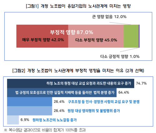 내년 3월 시행을 앞둔 개정 노조법(노란봉투법)을 두고 기업들의 법적 분쟁 우려가 커지고 있다. 한국경영자총협회(이하 경총)가 매출액 5천억원 이상 100개 기업을 대상으로 개정 노조법 시행 관련 이슈 진단을 실시한 결과, 응답 기업 87%가 내년 3월 시행 예정인 개정 노조법이 노사관계에 '부정적 영향'을 미칠 것으로 전망했다. 구체적으로는 '매우 부정적 영향'이 42.0%, '다소 부정적 영향'이 45.0%로 나타나, 기업 현장의 우려가 높은 것으로 확인됐다. 반면 '긍정적 영향'을 예상한 기업은 단 한 곳(1.0%)에 불과했다. 노사관계 악화를 우려하는 주된 이유(복수응답)로는 '하청 노조의 원청 대상 교섭 요청과 과도한 내용의 요구 증가'(74.7%)와 '법 규정의 모호성으로 인한 실질적 지배력 등을 둘러싼 법적 분쟁 증가'(64.4%)가 가장 많이 꼽혔다. 개정 노조법의 핵심인 '사용자 범위 확대'와 관련해, 기업들은 「법적 분쟁의 급증」을 가장 큰 리스크로 지목했다. 사용자 범위 확대로 인한 현장의 가장 큰 어려움을 묻는 설문(복수응답)에서, 응답 기업 77%가 '실질적 지배력 판단 기준이 모호해 원청의 사용자성 여부에 대한 법적 갈등 증가'를 꼽았다. '노조의 손해배상 책임 제한' 규정에 대해서는 기업 10곳 중 6곳이 노조 불법행위에 대한 면책 요구 증가를 우려했다. 손해배상 규정 변경이 가져올 변화를 묻는 질문(복수응답)에 대해, '노동조합의 불법행위에 대한 면책 요구 증가'를 예상한 기업이 59%로 가장 많았다. 주요기업들은 이러한 혼란을 막기 위해 국회의 보완입법이 시급하다고 입을 모았다. 조사 대상 기업 99%는 개정 노조법의 문제 해결을 위해 '국회 보완입법이 필요하다'고 응답했다. 보완입법이 필요 없다고 응답한 기업은 단 한 곳(1%)에 불과했다. 가장 시급한 보완입법 방향(복수응답)으로는 '법적 불확실성 해소 시까지 법 시행 시기 유예'(63.6%)가 압도적으로 높았다. 이어 '노동쟁의 대상이 되는 경영상 판단 기준 명확화'(43.4%), '사용자 개념 명확화'(42.4%) 순으로 나타났다. 장정우 경총 노사협력본부장은 “이번 조사는 내년 3월 법 시행을 앞두고 산업 현장의 우려가 매우 크다는 것을 보여준다”며, “설문 응답기업 99%가 보완입법을 요구하는 것은 법률의 불확실성이 해소되지 않은 채 시행될 경우 노사갈등과 혼란이 발생할 가능성이 매우 크다는 우려를 방증하는 것”이라고 지적하며 정부와 국회가 기업들의 우려를 받아들여, 법 시행 유예를 포함한 보완입법 논의에 나서줄 것을 당부했다.