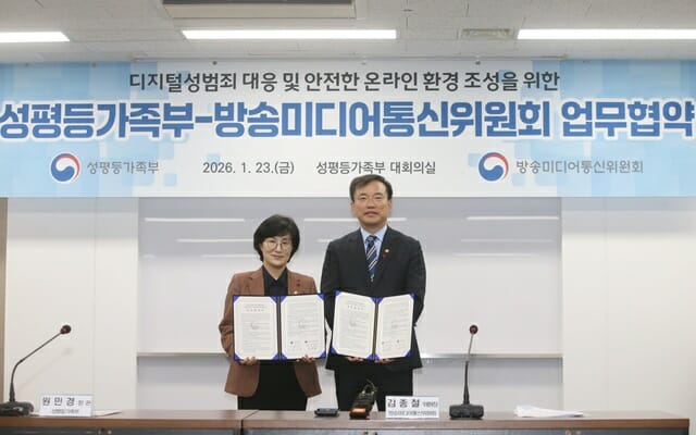 방송미디어통신위원회와 성평등가족부는 23일 오전 서울시 종로구 정부서울청사에서 안전한 디지털 사회 실현을 위한 업무협약(MOU)을 체결했다고 밝혔다. 양 기관은 불법 촬영물 등 유통 방지 및 피해 보호를 위한 지원을 강화하고 인공지능(AI) 환경 변화에 대응한 법, 제도 마련에 협력하기로 했다. AI를 악용한 딥페이크 성범죄물 생성 및 유통을 차단하기 위한 기술적, 관리적 보호 조치와 관련 피해 지원이 가능하도록 법, 제도 구축에 적극 협력할 예정이다. 정보통신사업자가 불법촬영물 등을 신속히 삭제, 차단하도록 감독을 강화하고, 같은 범죄물을 지속, 반복적으로 올리는 이용자와 홈페이지에 대한 제재도 강화한다. 청소년 보호를 위한 협력도 강화한다. 양 기관은 인공지능 관련 기업들이 사용자 연령 확인, 불법 유해 정보 유통 방지 등 청소년 보호를 위한 기술적 조치 의무 위반 시 제재 방안을 마련할 예정이다. 김종철 방미통위 위원장은 "오늘 체결하는 업무협약이 선언에 머무르지 않고 국민이 체감할 수 있는 변화로 이어질 수 있도록 상시적인 협업 체계를 구축해 나가겠다"고 밝혔다. 원민경 성평등가족부 장관은 "앞으로 국민이 모두 안심하고 이용할 수 있는 디지털 환경 조성을 위해 양 기관이 적극 협력할 것"이라고 말했다.