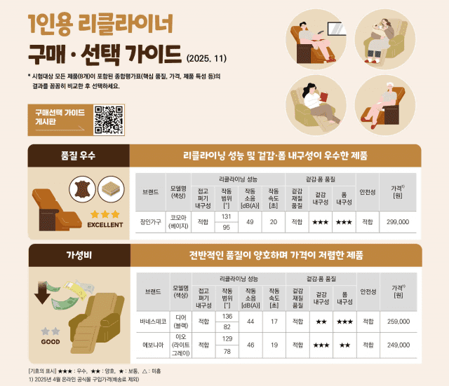 1인 가구 증가와 인테리어 트렌드 확산으로 수요가 커진 1인용 리클라이너 제품의 품질 차이가 적지 않은 것으로 나타났다. 한국소비자원은 시중 8개 리클라이너 제품을 대상으로 리클라이닝 성능, 겉감 및 폼 품질, 프레임 강도, 안전성 등을 비교·평가한 결과를 25일 발표했다. 시험 결과 리클라이너의 주요 성능과 재질 내구성에서 제품별 차이가 확인됐다. 100kg 인체 모형을 앉힌 상태에서 5천 회 반복 작동 시험한 결과, 8개 제품 모두 휨·파손 또는 작동 이상이 없어 관련 기준(EN 12520:2024)에 적합한 것으로 평가됐다. 등받이 최대 조절 각도는 129~142도, 작동 소음은 44~50dB(A), 접고 펼 때 걸리는 왕복시간은 14~22초로 제품 간 차이가 컸다. 등받이의 최대 조절 각도는 K05M(클렙튼) 제품이 142도로 가장 컸고 소음은 디어(바네스데코) 제품이 44dB(A)로 가장 조용했으며, 왕복 작동시간은 버겐(삼익가구) 제품이 14초로 가장 짧았다. 겉감(인조가죽) 재질 품질 시험에서 8개 중 7개 제품이 환경표지 기준(EL175)에 적합했다. 다만 R130(클라젠)은 건식 마찰견뢰도 3~4급으로 기준에 미달했다. 해당 업체는 지난 8월부터 개선된 제품을 판매 중이라고 회신했다. 겉감의 내굴곡성·내마모성·겉면 균열강도를 종합 평가한 결과, 이오(에보니아), 코모아(장인가구), R130(클라젠), K05M(클렙튼) 등 4개 제품이 평균 이상으로 우수한 내구성을 보였다. 폼(쿠션)의 영구압축줄음률·반복압축줄음률 시험에서 6개 제품은 기준(각각 10%, 7% 이하)에 충족하며 우수한 성능을 보였다. 그러나 EV7104(썬퍼니처)는 영구압축줄음률 12%로 기준에 미달해 개선 권고를 받았다. 팔걸이와 좌면·등받이에 각각 30kg·150kg 하중을 가한 시험에서 모든 제품이 파손·변형이 없었다. 넘어짐, 누전·감전, 유해물질 등 안전성은 전 제품이 관련 기준에 적합했다. 조사 대상 모든 제품이 제조일자, 제조자, 사후 서비스(A/S) 연락처 등 의무 표시사항 일부를 누락한 것으로 나타났다. K05M(클렙튼)은 폼에 '항균성'을 표시했으나 시험 결과 항균 효과가 없는 것으로 확인됐다. 소비자원은 8개 업체에 표시 개선을 권고했으며, 모든 업체가 올해 12월까지 보완하겠다는 계획을 제출했다. 소비자원은 "리클라이너 구매 시 설치 공간·용도·부가 기능 등을 고려하고, 리클라이닝 성능, 겉감·폼 내구성 등을 꼼꼼히 비교해야 한다"고 전했다.