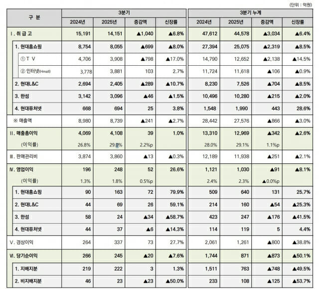 현대홈쇼핑이 올해 3분기 별도 기준으로 영업이익이 큰 폭으로 늘며 수익성을 개선했다. 식품·주얼리 등 소비 트렌드에 맞춘 편성 전략이 주효했다는 평가다. 다만 건설경기 침체와 소비심리 둔화로 종속회사의 실적이 부진하면서 연결 기준 매출은 소폭 감소했다. 5일 현대홈쇼핑은 올해 3분기 연결기준 영업이익 248억원을 기록해 전년 동기 대비 26.6% 증가했다고 밝혔다. 3분기 연결기준 매출은 8천739억원으로 전년 동기 대비 2.7% 감소했다. 별도 기준 3분기 매출은 2천643억원으로 전년 동기보다 3.3% 늘었으며 영업이익은 163억원으로 79.9% 급증했다. 회사 측은 가전 및 렌탈상품 등 고단가 상품군 편성 축소로 취급고 매출은 전년 동기 대비 8.0% 감소했으나, 추석 명절 행사 호조 및 금·주얼리 상품 확대로 영업이익은 같은 기간 79.9% 증가했다고 설명했다. 현대L&C의 경우 국내 건설경기 부진으로 인해 매출은 전년 동기 대비 10.7% 감소했으나, 원가 개선으로 영업이익은 같은 기간 59.1% 증가했다. 한섬은 지속적인 패션소비 위축 및 원가 상승 영향으로 전년대비 매출 1.5% 줄었고, 영업이익 또한 58.7% 감소했다. 현대퓨처넷은 자회사인 현대바이오랜드 매출 증가 영향으로 매출은 전년 동기 대비 3.8% 증가했으나, 광고비 등 일시적 판매관리비 증가로 영업이익은 같은 기간 14.3% 감소했다.