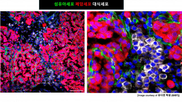 폐암세포가 눈에 보이는 종양으로 성장하기 훨씬 이전부터 주변 세포와 신호를 주고 받으며, 주위 환경을 암과 친화적인 환경으로 길들이는 구체적인 과정이 세계 처음 과학적으로 규명됐다. 폐암 발병 자체를 원천 차단할 새로운 길을 찾았다는 평가다. 광주과학기술원(GIST)은 최진욱 생명과학과 교수 연구팀이 이주현 미국 메모리얼 슬론 케터링 암센터(MSK) 교수 연구팀과 폐암 발생 초기 단계 세포 간 연쇄 반응 구조를 규명했다고 29일 밝혔다. 연구결과는 세계 3대 과학 저널 '네이처'에 온라인으로 게재됐다. 폐 선암(LUAD)은 사망률이 매우 높은 암종이다. 초기 증상이 거의 없는 탓에 병이 상당히 진행된 상태에서 주로 발견돤다. 나중엔 치료가 어려워 사망률이 높은 이유다. 학계에서는 폐 줄기세포(AT2) 유전자 돌연변이(KRAS G12D)가 어떻게 암으로 발전하는지 연구해 왔으나, 돌연변이 세포가 주변 정상 조직을 암 친화적인 '섬유화 미세환경'으로 길들이는 구체적인 과정은 베일에 싸여 있었다. 한-미 연구팀이 이를 과학적으로 규명하고, 치료방법까지 제시했다. 연구팀은 마우스 모델과 인공 장기 '3차원 폐 오가노이드' 실험으로 돌연변이 세포가 주변 세포를 포섭, 종양 형성을 돕는 '자기 지속적 회로'를 찾아냈다. 연구팀에 따르면, 폐암 발생은 크게 3단계의 연쇄 반응을 거친다. 유전자 돌연변이가 발생한 폐 줄기세포가 '암피레귤린(AREG)'이라는 신호 물질을 대량 분비하며 주변 세포에 공격적인 신호를 보내기 시작하는 것이 1단계다. 이어 2단계에서는 이 신호를 받은 주변 섬유아세포들이 본래의 조직 복구 기능을 상실한 채, 조직을 딱딱하게 변형시키는 '섬유화 상태'로 전환된다. 주변환경을 친암세포화 환경으로 만드는 과정이다. 3단계에서는 조성된 섬유화 환경이 면역세포(대식세포)를 불러들여 염증 반응을 극대화하고, 이 염증 신호가 다시 돌연변이 세포의 악성 변화를 촉진하는 '자기 증폭 회로'를 완성한다. 최진욱 교수는 "연쇄 반응 핵심 고리인 '암피레귤린 신호 축'을 유전적·약물적 방법으로 차단했을 때, 섬유화 미세환경 형성이 억제되며 폐암 초기 발생이 현저히 저지되는 것을 확인했다"고 말했다. 실제 환자 병태생리 환경에서 재현 검증은 연세대학교 세브란스병원 박무석 교수 연구팀이 지원했다. 최 교수는 "폐암 발생을 극초기에 억제하는 차세대 예방 및 정밀 맞춤형 치료 패러다임을 여는 전환점이 될 것”이라고 밝혔다.