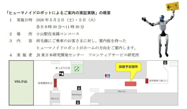 일본 기차역에서 휴머노이드 로봇을 활용해 탑승객에 안내 서비스를 제공하는 실증 실험이 시작됐다. 씨넷재팬에 따르면 동일본여객철도(JR동일본) 오미야 지사는 5월2일과 5월5일 이틀간 도치기현 오먀마역 재래선 역사 내에서 휴머노이드 실증에 나선다. 실증에서는 오야마역과 신마에바시역을 잇는 료모선 탑승객 대상으로 안내판을 든 휴머노이드 로봇이 동작으로 승강장 방향을 안내하는 식으로 이뤄진다. 로봇은 보행하지 않는다. 실증 중에는 JR동일본 연구개발센터 프론티어 서비스 연구소 직원이 상시 모니터링을 실시할 예정이다. 기차 탑승객과 접촉을 방지하기 위해 주변에는 펜스와 완충재를 설치한다. JR동일본 그룹은 그룹 경영 비전 '유쇼 2034' 실현을 목표로, 로봇을 활용한 새로운 가치 창출과 업무방식 혁신을 추진하고 있다. 휴머노이드 실정도 로봇 안내가 승객 이동 편의성에 얼마나 기여하는 지 검증하기 위해 마련됐다. 이에 따라, 실증 장면과 역내 유동 인구 등은 동영상으로 녹화해 안내 효과를 측정할 예정이다.