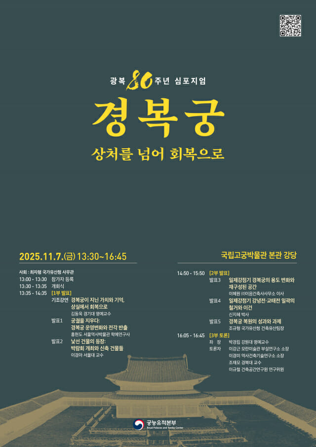 국가유산청 궁능유적본부는 '광복 80주년 경복궁, 상처를 넘어 회복으로'를 주제로 학술 토론회를 개최한다고 5일 밝혔다. 이번 토론회는 오는 7일 국립고궁박물관 본관 강당에서 진행된다. 광복 80주년을 맞아 1990년부터 35년간 이어진 경복궁 복원사업의 과정을 돌아보고, 현재 추진 중인 '제2차 경복궁 복원 기본계획(2011~2045)'의 방향과 과제를 논의하기 위해 마련됐다는 설명이다. 경복궁은 조선왕조의 법궁이었으나 일제강점기 총독부 청사 건립, 박람회 개최 등으로 주요 전각이 철거되는 등 심각한 훼손을 겪었다. 1990년부터 추진된 복원사업을 통해 훼철된 전각들이 복원되며 민족 정체성 회복의 상징으로 자리매김해왔다. 행사는 김동욱 경기대학교 교수의 '경복궁이 지닌 가치, 상실에서 회복으로' 기조발표로 시작한다. 이어 ▲궁궐을 지우다: 경복궁 운영변화와 전략 변화(홍현도, 서울역사박물관) ▲낯선 건물의 등장: 박람회 개최와 신축 건물들(이경아, 서울대학교) ▲일제강점기 경복궁의 용도 변화와 재구성된 공간(이혜원, 이음건축사사무소) ▲일제강점기 강녕전·교태전 일곽의 철거와 이건(신지혜, 한국전통문화대학교) ▲경복궁 복원의 성과와 과제(조규형, 국가유산청) 등 총 5편의 발표가 진행된다. 이후 박경립 한국전통문화대학교 석좌교수를 좌장으로 조재모(경북대학교), 이경미(역사건축기술연구소), 이규철(건축공간연구원), 이강근(모란미술관부설연구소) 등이 참여하는 종합토론이 이어진다. 이번 학술 토론회는 국민 누구나 당일 현장 등록을 통해 무료로 참가할 수 있다. 국가유산청 궁능유적본부는 "경복궁 복원사업이 단순히 옛 건물을 다시 세우는 일이 아니라, 일제강점기 훼철된 경복궁의 상처를 치유하고 역사적 정체성을 되찾는 과정인 만큼, 이번 기회를 통해 학계 전문가들을 비롯해 국민 모두와 함께 경복궁 복원의 의미를 함께 나눌 수 있기를 기대한다"고 밝혔다.