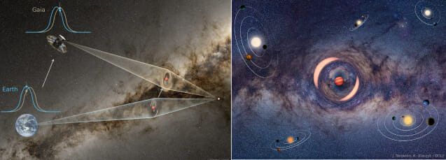 태양계 밖 우리은하에서 지구보다 대략 95배 더 무거운 토성급 '나홀로 행성'이 발견됐다. 미시중력렌즈 현상으로 발견한 것은 9번째, 아인슈타인 반경 밖에서 발견되기는 처음이다. 이 발견 내용은 국제학술지 사이언스에 2일(한국시간) 발표됐다. 우주항공청(우주청)은 한국천문연구원이 참여한 국제 공동 연구진이 우리나라 외계행성탐색시스템(KMTNet)과 유럽우주국 가이아(GAIA) 우주망원경으로 토성급 질량을 보유한 '나홀로 행성'을 발견했다고 밝혔다. 나홀로 행성은 우주 공간을 홀로 떠도는 행성으로 행성계 형성과 진화를 이해하는 중요한 단서를 제공한다. 이번에 발견된 '나홀로 행성'은 국제천문연맹(IAU)가 'KMT-2024-BLG-0792'로 명명했다. KMT는 한국중력렌즈망원경(KMTNet)을 의미하고, 나머지 숫자는 2024년 우리은하 중심부 방향에서 발견한 792번째 중력미소렌즈 관측을 뜻한다. 이 행성은 토성 질량 대비 약 0.7배에 해당한다. 지구로부터 1만 광년 가량 떨어져 있다. 이 행성은 기존과 달리 지상망원경과 우주망원경을 동시에 활용해 지구로부터 떨어진 거리를 측정했다. 이 같은 방법으로 거리를 측정한 경우는 처음이다. 현재 나홀로 행성을 발견할 수 있는 유일한 방법은 미시중력렌즈 현상을 이용하는 것이다. 천문연 KMTNet 연구진은 미시중력렌즈 현상으로 이번 나홀로 행성을 발견했다. 이 현상이 일어날 당시 가이아 우주망원경이 동일 영역을 16시간 동안 6차례 관측한 자료를 바탕으로 행성 거리와 질량을 정확하게 측정했다. KMTNet은 칠레, 호주, 남아프리카공화국에 각각 설치된 망원경을 통해 24시간 연속 관측이 가능하다. 이로인해 미시중력렌즈 현상이 짧게 발생하는 '나홀로 행성'도 놓치지 않고 발견할 수 있다. 미시중력렌즈 현상은 렌즈 역할을 하는 별이 배경 천체(관측 대상 배경) 앞을 지날 때 밝기가 급상승했다가 감소하는 현상이다. 한국천문연구원 이충욱 책임연구원은 "이번 발견은 중요한 학문적 의미를 갖는다"며 "지금까지 미시중력렌즈를 통해 발견된 나홀로 행성 9개는 모두 '아인슈타인 데저트'라고 불리는 특정 범위 아인슈타인 반경 밖에서 발견되었으나, 이번 행성은 아인슈타인 데저트 내에서 발견된 첫 번째 사례"라고 말했다. 아인슈타인 반경은 미시중력렌즈 현상을 일으키는 물체 중력장이 빛을 휘게 하는 정도를 정의하는 물리적인 반경을 말한다. 아인슈타인 데저트는 약 9~25마이크로초각(µas))에 해당하는 천체가 거의 관측되지 않는 현상을 말한다. 이 범위에 속하는 질량대 천체가 드물거나, 형성 메커니즘이 다르기 때문일 수 있다는 가설이 있다. 각반경 크기는 천체 질량이 클수록 커지며, 아인슈타인 테저트 왼쪽(≤9µas)은 질량이 작은 행성, 오른쪽(≥25µas)은 갈색왜성과 별들로 보인다. 연구팀은 수보(Subo Dong, 1저자 및 교신저자, 베이징대), 젝수안 우(Zexuan Wu, 2저자, 베이징대), 류윤현 연구원(3저자, 천문연), 이충욱 연구원(교신저자, 천문연) 등이 참여했다. 우주청 강경인 우주과학탐사부문장은 “천문연에서 구축한 KMTNet 덕분에 미시중력렌즈 현상을 이용한 행성 발견에 우리나라가 기여하고 있다"며 "향후에도 지상망원경과 국제 우주망원경들 간 동시관측 등을 통해 새로운 발견을 지속 지원할 것"이라고 말했다.