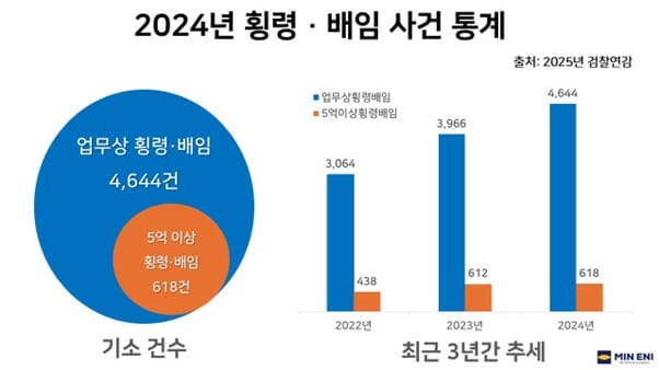비대면 금융거래가 일상화되면서 기업 자금 관리 허점이 도마 위에 올랐다. 디지털 환경을 악용한 횡령·배임 수법이 갈수록 지능화되는 반면, 이를 막기 위한 기업 내부 통제 체계는 여전히 취약하다는 지적이 나온다. 14일 민이앤아이가 발표한 2025년 검찰연감 통계 분석 결과에 따르면 2024년 한 해 동안 업무상 횡령 및 배임으로 기소된 사건은 총 4천644건으로 집계됐다. 이는 전년 대비 17% 증가한 수치다. 점유이탈물 횡령 등 단순 사건을 제외한 것으로, 형사 절차로 이어지지 않은 사건까지 감안하면 실제 발생 규모는 더욱 클 것으로 분석됐다. 특히 코로나19로 인한 사회적 거리두기가 종료된 이후 업무상 횡령·배임 사건은 2년 연속 급증세를 보이고 있다. 2023년에는 전년 대비 29% 증가하며 기업 자금 관리 리스크가 지속 확대되고 있는 것으로 나타났다. 이는 하루 평균 약 12.7건, 두 시간에 한 번 꼴로 업무상 횡령·배임 사건이 기소되고 있는 것으로 풀이된다. 사실상 기업 대부분이 횡령이나 배임 같은 자금사고로부터 자유롭지 못하다는 설명이다. 피해 규모 역시 확대되는 양상이다. 피해액이 5억원을 넘어 특정경제범죄 가중처벌 등에 관한 법률이 적용된 횡령·배임 사건은 전년 대비 소폭 증가한 618건으로 집계됐다. 이는 횡령·배임이 기업의 중대 리스크로 진화하고 있음을 시사한다. 이번 분석 결과를 발표한 민이앤아이는 경찰 전문 로펌인 법무법인 민의 자회사로, IT 기술과 법률 전문가의 노하우를 융합하는 작업에 앞장서고 있다. 지난해에는 자금사고 방지시스템 '갖추(GOTCHOO)'를 론칭했다. 경찰청 감사담당관을 역임한 박기태 민이앤아이 대표는 "2024년 횡령 사건이 증가한 이유는 주식·도박·가상화폐 등 투기성 거래 유혹에 빠진 임직원이 늘어난 점과 디지털 기반 비대면 금융거래가 증가하며 횡령수법이 더욱 다양해지고 교묘해진 반면, 기업의 자금사고 방지 시스템은 취약하다는 점 때문으로 보인다"고 분석했다. 이어 "상장사 및 외부감사대상법인의 경우 지난해부터 내부회계관리제도에 따라 자금부정통제활동 공시가 의무화된 만큼, 정부에서 요구하는 각종 규정과 법적 기준을 준수하기 위해선 '갖추(GOTCHOO)'와 같은 자금사고 방지 솔루션 도입을 적극 검토할 필요가 있다"고 강조했다.