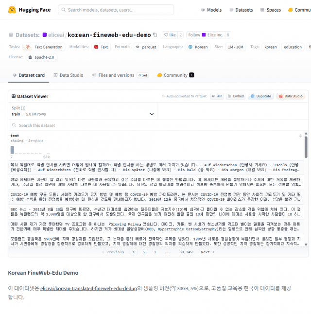 엘리스그룹(대표 김재원)이 한국어 교육용 데이터셋 2종을 글로벌 오픈소스 플랫폼 '허깅페이스'에 공개했다고 14일 밝혔다. 엘리스그룹은 한국어 AI 모델 학습에 적합한 고품질 데이터를 연구자, 개발자, 기업이 폭넓게 활용할 수 있도록 제공해 국내외 AI 연구·개발 활성화를 지원할 계획이다. 이번에 공개된 데이터셋은 거대 언어 모델(LLM)의 한국어 성능을 학술·교육 도메인에서 강화하기 위해 설계된 '한국어 파인웹 교육 데이터셋 데모'와 '한국어 웹 텍스트 교육 데이터셋' 2종으로 구성됐다. 한국어 파인웹 교육 데이터셋 데모는 영문 교육용 웹 텍스트 코퍼스(Corpus, 말뭉치)인 FineWeb-Edu를 한국어로 번역한 데이터셋 'korean-translated-fineweb-edu-dedup'의 5%를 샘플 형태로 구성한 데모다. 학술·교육 도메인의 한국어 LLM 학습에 활용할 수 있도록 설계했으며, 대규모 학습에 앞서 데이터 특성과 활용 가능성을 검증하는 용도로 제공된다. 데모의 원본인 korean-translated-fineweb-edu-dedup은 약 1천900억(190B) 토큰 규모의 대형 텍스트 데이터셋으로 수천만 페이지 분량에 해당한다. 다국어 데이터를 함께 활용할 경우 파운데이션 모델 학습에 활용 가능한 수준의 규모다. 이번에 공개한 한국어 파인웹 교육 데이터셋 데모는 이 중 5% 분량의 샘플이지만 오픈소스로 공개된 한국어 고품질 데이터셋 중에서는 대규모 수준에 해당한다. 함께 공개된 한국어 웹 텍스트 교육 데이터셋은 대규모 한국어 웹 텍스트에서 교육적 가치 점수를 통과한 콘텐츠만 선별해 구축했다. 사실성·문맥 일관성·교육 적합성을 평가해 한국어 AI 모델 학습에 활용할 수 있도록 구성했다. 이번 데이터셋 공개는 엘리스그룹이 AI 인프라, 모델 학습, 교육·산업 현장 적용까지 축적해 온 경험을 바탕으로 이뤄졌다. 엘리스그룹은 이번 데이터셋 공개를 통해 한국어 AI 연구 환경의 진입 장벽을 낮추는 한편, 교육·연구·공공 영역에서 한국어 AI 모델 활용을 지원할 계획이다. 또 AI 인프라·클라우드·데이터 엔지니어링 역량과 연계해 한국어 특화 AI 서비스와 솔루션 개발을 가속화한다는 전략이다. 엘리스그룹 김수인 CRO는 “데이터 접근성과 품질은 AI 기술 발전의 핵심 요소”라며 “엘리스그룹은 실제 모델 학습과 서비스 환경에서 검증된 기준을 적용해 연구자와 개발자, 기업이 보다 쉽게 활용할 수 있는 고품질 데이터셋을 구축했다”고 말했다. 이어 “앞으로도 데이터·모델·인프라를 아우르는 기술 역량을 기반으로 한국어 AI 연구와 산업 생태계 성장에 지속적으로 기여하겠다”고 덧붙였다.