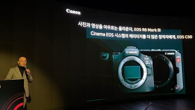 "국내 시장의 카메라 수요는 사진 70%, 영상 30% 가량으로 사진 관련 비중이 여전히 크다. 그러나 고품질 영상 관련 수요는 여전히 존재한다. 사진과 영상 모두에 맞는 제품을 국내 공급해 전체 시장을 이끄는 것이 목표다." 27일 오전 서울 삼성동 스튜디오159에서 열린 하반기 전략 신제품 기자간담회에서 정병림 캐논코리아 마케팅 부문장이 이렇게 강조했다. 이날 캐논코리아는 영상 수요를 겨냥한 풀프레임 센서 미러리스 카메라 2종을 공개했다. 기동성이 중요한 촬영 환경에서 창작자들의 유연한 환경 구성에 중점을 둔 EOS C50, 화소 수를 3천250만 화소로 늘린 EOS R6 마크Ⅲ 등 두 가지 제품이다. EOS C50, 본체 부피 줄여 기동성·표현력 확대 EOS C50은 신규 개발한 7K(7144×4790 유효화소) 풀프레임 CMOS 센서와 디직 DV 7 영상처리엔진을 바탕으로 최대 7K/60p RAW 영상을 카메라 내부 CF익스프레스 카드에 직접 기록할 수 있다. 황종환 캐논코리아 매니저는 "EOS C50은 본체(바디) 크기와 무게를 줄여 직접 들고 촬영하는 '런앤건' 스타일 촬영과 드론을 이용한 항공 촬영 등 표현 범위가 넓은 카메라"라고 설명했다. 듀얼 픽셀 CMOS AF Ⅱ 기술로 사람과 개, 고양이, 새 등 동물의 눈과 얼굴, 전신을 인식하며 AF 속도는 10단계, 피사체 전환 감도는 5단계로 조절할 수 있다. 4K 영상을 XF-HEVC S나 XF-AVC S로 촬영할 경우 7K 영상 기반으로 선명도를 높이는 오버샘플링을 거쳐 4K 4:2:2 10비트 고해상도 기록이 가능하다. 4K/120p, 2K/180p 고속 영상 촬영 기능도 지원한다. 전체 영역 촬영 후 숏폼 등 다양한 화각으로 영상을 잘라낼 수 있는 오픈게이트 레코딩도 지원한다. 4K 촬영 시 전체 화면 비율과 크롭 부분을 동시 녹화하는 기능도 제공해 작업 편의성을 높였다. 부피와 무게를 줄이기 위해 빠진 기능도 있다. 셔터는 전자식 셔터만 탑재했고 손떨림 억제(IS) 기능은 디지털 방식과 렌즈에 의존한다. 황종환 매니저는 "외풍이 심하게 부는 환경에서는 오히려 장애물이 될 수 있다"고 설명했다. EOS C50은 27일 정식 출시됐다. 가격은 본체 기준 522만 9천원이며 손잡이와 음향 조절 기능을 더한 핸들 유닛이 기본 제공된다. EOS R6 마크Ⅲ, 화소 수 향상으로 해상력 강화 EOS R6 마크Ⅲ는 2020년 8월 출시된 'EOS R6', 2022년 11월 출시된 'EOS R6 마크Ⅱ 후속 제품이다. 전작(2천420만 화소) 대비 화소 수를 33% 높인 3천250만 화소 CMOS 센서를 탑재해 해상력을 강화했다. 기계식 셔터 기준 초당 최대 약 12매, 전자식 셔터 기준 초당 최대 약 40매 고속 촬영이 가능하며 촬영 사진을 임시로 담는 버퍼 메모리를 확장해 JPEG 파일 기준 330매, RAW 파일 기준 150매까지 연속 촬영 가능하다. 셔터 반누름 상태에서 최대 20장을 저장하는 사전 연속 촬영 기능이 추가됐다. 바디 내 5축 손떨림 보정(IS) 기능은 통합 제어 시 중심부 최대 8.5스톱, 주변부 7.5스톱까지 보정하며, 대부분의 RF 및 EF 렌즈와 호환된다. EOS C50에 포함된 오픈 게이트 영상 녹화 기능은 EOS R6 마크Ⅲ에도 포함됐다. 영상 촬영에는 초점이 맞기 전 렌즈 구동 모터 속도를 조절해 수동으로 초점을 맞출 때와 같은 포커스 가감속 알고리즘을 적용했다. EOS R6 마크Ⅲ는 오는 12월 10일 출시 예정이다. 가격은 본체(바디) 기준 349만 9천원으로 2022년 출시된 전작(319만 9천원) 대비 10% 상승했다. 정병림 캐논코리아 부문장은 "3년 전 당시 환율과 현재를 고려하면 가격 상승을 최대한 억제했고 미국이나 일본 등 타 국가 출시 가격과 크게 다르지 않다"고 설명했다. "기존 출시 렌즈로 7K RAW 영상 대응 가능" 이날 공개된 카메라 신제품 2종은 모두 7K RAW 촬영을 지원한다. 카메라 본체는 물론 렌즈 자체의 해상력도 이에 맞게 높아져야 하는 상황이다. 황종환 캐논코리아 매니저는 "기존 출시된 렌즈를 최신 카메라에 연결할 경우 색수차 등이 문제가 된다. 기존 DSLR용으로 설계된 EF 렌즈와 미러리스용으로 설계된 RF 렌즈 모두 충분히 활용할 수 있고 카메라 내장 렌즈 최적화 기능으로 보완 가능하다"고 설명했다. 이날 현장에서는 지난 21일 50만원 중반대에 국내 출시된 신규 렌즈인 'RF45mm F1.2 STM' 품귀현상 관련 지적도 나왔다. 국내 도입 초기 물량이 소진되자 일부 업체가 정가의 두 배 가까운 90만원을 받고 있다는 것이다. 정병림 캐논코리아 마케팅 부문장은 "해당 렌즈는 국내 포함 글로벌 시장에서 좋은 반응을 얻고 있다. 초기 물량에 제약이 있지만 내년부터는 공급 물량을 확대해 국내 시장 소비자가 불편함을 겪지 않도록 하겠다"고 답했다.