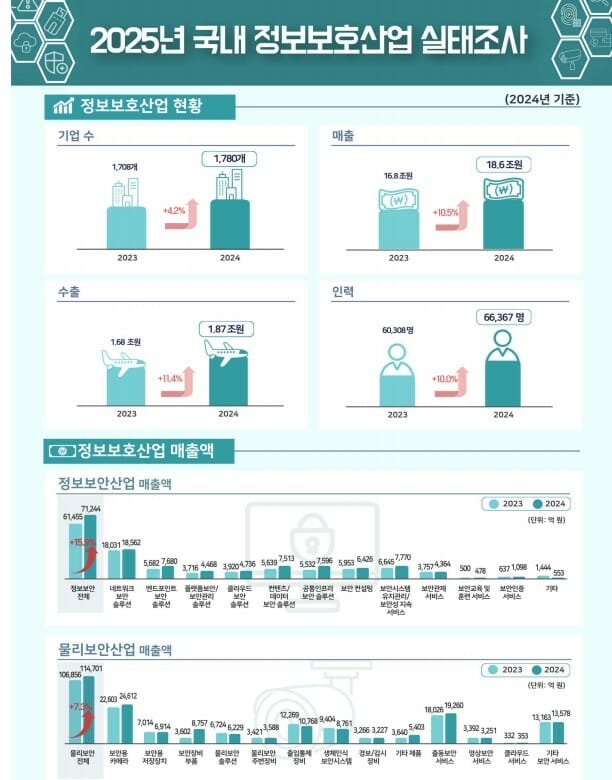 과학기술정보통신부(과기정통부)는 6일 '2025 정보보호산업 실태조사'를 발표했다. 이번 조사는 (국가승인통계(승인번호 제127013호)로 한국정보보호산업협회(회장 조영철, KISIA)가 용역을 받아 수행했다. '2025년 실태조사'지만 조사에 나오는 데이터느 2024년 현황이다. 조사에 따르면, 2024년 기준 국내 정보보호 기업은 1780개사다. 전년(1708개사) 보다 약 4.2% 증가했다. 이 중 정보보안 기업은 876개사(전년 대비 7.6%↑), 물리보안 기업은 904개사(전년 대비 1.1%↑)다. 전체 1780개사 중 정보보호를 주사업으로 영위하는 기업은 1239개사, 사업 일부를 영위하는 기업은 541개사로 집계됐다. ■ 물리보안 기업은 904곳에 매출 11조 4701억, 종사자 4만2380명 또 2024년 기준 국내 정보보호 산업 전체 매출액은 약 18조 5945억 원이다. 전년 대비 10.5% 상승했다. 이중 정보보안은 약 7조 1244억 원(전년 대비 15.9%↑), 물리보안은 약 11조 4701억 원(전년 대비 7.3%↑)으로 조사됐다. 정보보안 분야는 공통인프라 보안 솔루션(7596억원, 37.3%↑), 엔드포인트보안 솔루션(7680억원, 35.2%↑) 부문이 높은 성장세를 기록했다. 물리보안 분야는 보안장비 부품이 8757억원으로 전년비 143.1%나 상승했다. 보안용 카메라도 2조 4612억원으로 8.9% 성장했다. 2024년 기준 국내 정보보호 산업 전체 수출액은 약 1조 8722억 원으로 전년대비 11.4% 늘었다. 이중 정보보안 수출은 1242억 원으로 전년 대비 15.9% 증가했다. 물리보안 수출은 1조 7480억 원으로 14.1% 늘었다. 정보보안 분야는 글로벌 빅테크 기업의 클라우드보안 투자 확대 등으로 클라우드 보안 솔루션 수출이 크게 감소했지만, 엔드포인트보안와 컨텐츠/데이터 보안 솔루션 부문이 일부 증가했다. 물리보안 분야는 생체인식 보안시스템, 출입통제 장비 수출이 감소한 반면, 보안장비 부품의 경우 전년도 대비 크게 증가했다. 클라우드 보안 수출은 2억 원(99.5%↓), 엔드포인트보안은 115억 원(39.1%↑), 컨텐츠 및 데이터 보안은 70억 원(57.2%↑)에 달했다. 또 생체인식 보안시스템은 932억 원(56.4%↓), 출입통제 장비는 701억 원(40.7%↓), 보안장비 부품은 5298억 원(429.3%↑) 의 수출액을 보였다. 작년 기준 정보보호 기업의 전체 종사자 수는 총 6만6367명으로 전년 대비 10% 증가했다. 이중 정보보안기업 종사자 수는 2만3987명(전년 대비 0.2%↑)으로 크게 변동은 없었지만 물리보안 종사자 수는 4만2380명으로 전년 대비 16.6% 증가했다. 2만3987명의 기업 재직 정보보안 종사자 중 연구 및 개발 분야가 7482명(8.6%↑), 보안컨설팅 1957명(7.1%↑), 엔지니어 7261명(19.7%↓)에 달했다. 과기정통부 최우혁 네트워크정책실장은 “AI 활용 환경과 제로트러스트 기반 보안체계 등 새로운 보안 환경이 빠르게 확산됨에 따라, 정보보호 산업은 신기술 개발, 전문 인력 양성, 제도·규제 개선을 동시에 추진해야하는 새로운 전환기에 직면해 있다”면서 “정보보호산업 실태조사는 이러한 국내 보안 산업의 변화와 성장 가능성을 진단하고 정책 방향을 설정하는 데 있어 중요한 근거 자료로 활용된다. 앞으로도 정확하고 의미 있는 정보를 제공해 산업 경쟁력 강화에 기여할 수 있게 최선을 다하겠다”고 밝혔다. 이번 정보보호산업 실태조사 결과는 정보보호산업진흥포털(www.ksecurity.or.kr)과 한국정보보호산업협회 누리집에서 확인할 수 있다.